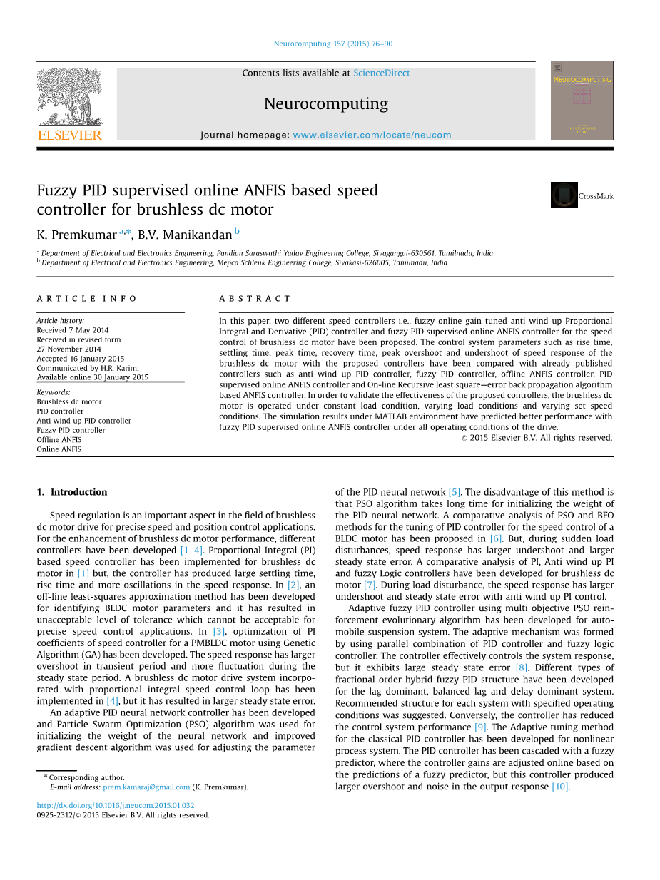 针对无刷直流电机的速度控制,提出了两种控制器,即模糊在线增益调节的抗卷绕PID控制器和模糊PID监督的在线ANFIS控制器。