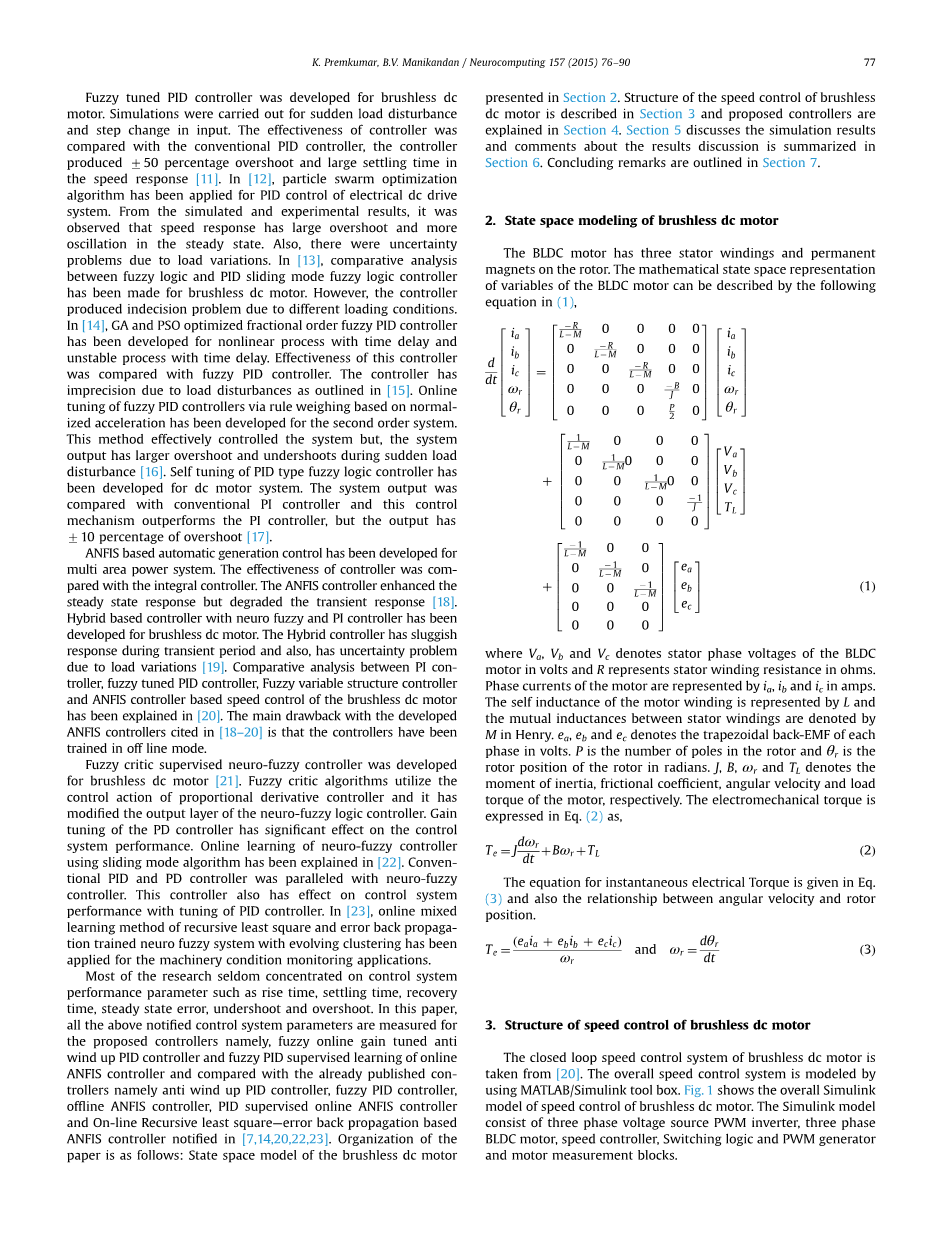 大多数研究很少集中在控制系统的性能参数上,如上升时间、稳定时间、恢复时间、稳态误差、欠冲和超冲。本文对所提出的控制器,即模糊在线增益整定的抗卷绕PID控制器和在线ANFIS控制器的模糊PID监督学习,对上述所有通知的控制系统参数进行了测量,并与已有的抗卷绕PID控制器、模糊PID控制器进行了比较,文[7,14,20,22,23]中给出了离线ANFIS控制器、PID监督的在线ANFIS控制器和基于递推最小二乘误差反向传播的在线ANFIS控制器。论文的主要工作如下:第二节提出了无刷直流电动机的状态空间模型。无刷直流电动机的速度控制结构在第3节中进行了描述,所提出的控制器在第4节中进行了说明。第5节讨论了仿真结果,第6节总结了对结果讨论的意见。第7节概述了结束语。