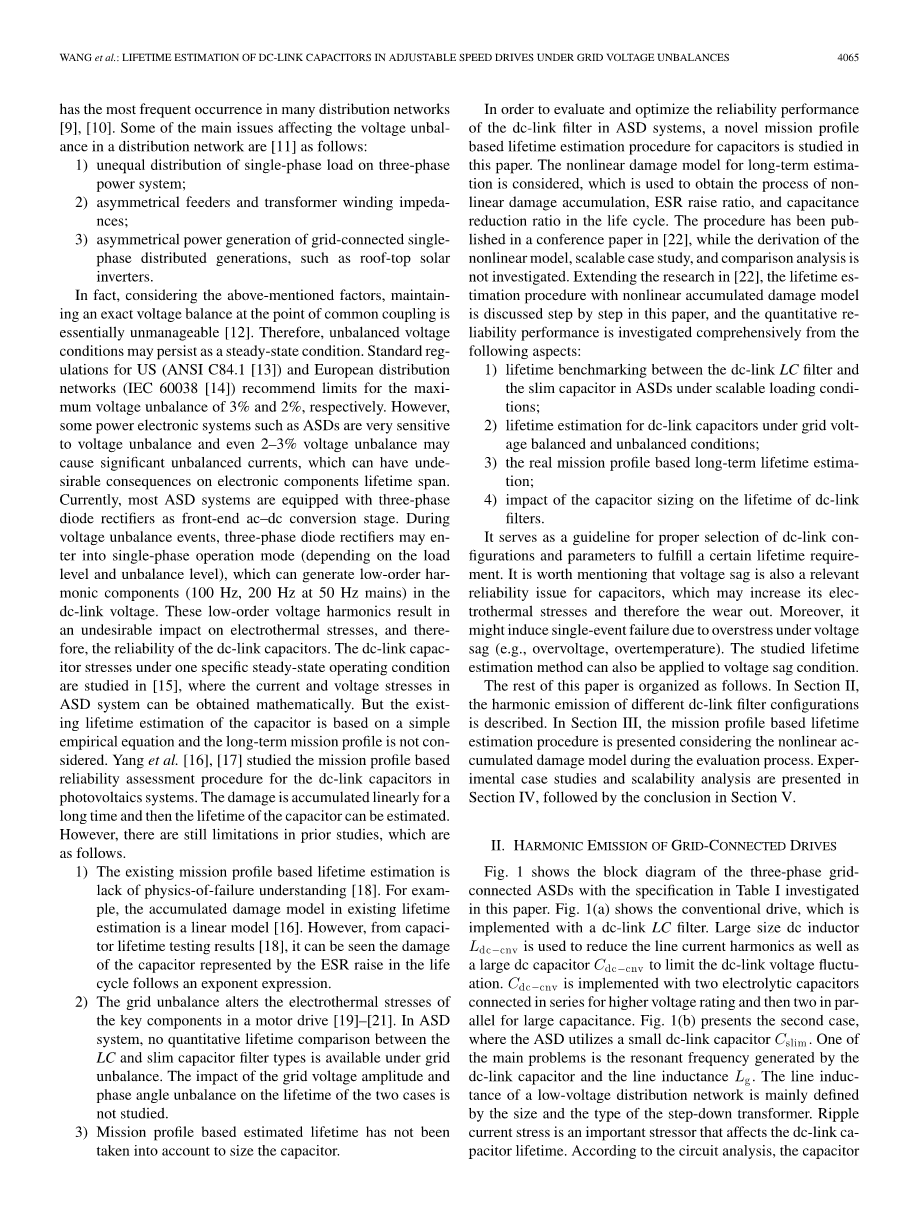 事实上,考虑到上述因素,在公共连接点上保持精确的电压平衡基本上是不可控制的。因此,不平衡电压条件是持续稳定状态。美国(ANSI C84.1[13])和欧洲配电网络(IEC 60038[14])的标准规定建议最大电压不平衡分别为3%和2%。然而,一些电力电子系统,如ASDs,对电压不平衡非常敏感,即使是2-3%的电压不平衡也会导致明显的不平衡电流,这可能会对电子元件的寿命造成不良的影响。目前,大多数ASD系统都配备了三相二极管整流器作为前端的交直流转换阶段。当电压不平衡事件发生时,三相二极管整流器可进入单相运行模式(取决于负载电平和不平衡电平),在直流链路电压下可产生低次谐波分量(100Hz、200Hz、50Hz市电)。这些低次电压谐波会对电热学应力产生不良影响,从而影响直流电容器的可靠性。在[15]中研究了某一特定稳态工作条件下直流环节电容器的应力,从而得到了ASD系统的电流和电压应力。但现有的寿命估计是基于一个简单的经验公式,对长期的时间剖面没有考虑。Yang等人研究了基于任务剖面的光伏系统直流支撑电容器可靠性评估方法。这种损害会在很长一段时间内直线累积,也会在很长一段时间内无法估计。然而,前人的研究仍存在以下局限性。