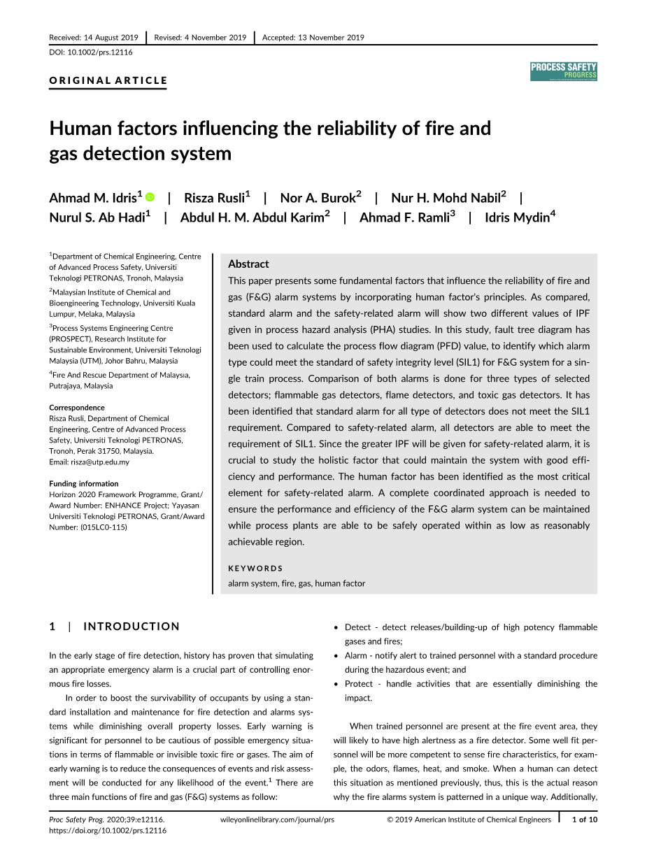 以上研究表明,需要研究影响F&G检测系统效率和有效性的人为因素。上述研究大多不讨论在过程工厂中需要安装的警报类型,以达到目标SIL。因此,本研究将讨论一个标准警报和安全相关警报的比较,并实现SIL两者。为了进一步分析该系统,确定和讨论影响安全相关警报有效性的最大影响因素。