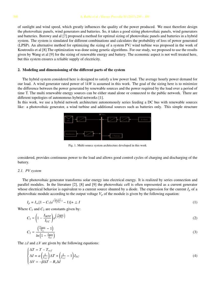 能源稀缺,发电成本增加以及能源需求不断增长需要现代电力系统的最佳经济调度。可再生能源组合的最佳管理通常用于未连接到公共电网的区域中,作为发电的柴油发电机的补充或替代。能源管理的主要目标是有效满足负荷的能源需求,促进可再生能源的发展和优化成本。已经进行了若干研究以通过调整系统的大小或不同来源的影响程度来克服这些问题。[1][2][3][4]文献中有几项关于能源管理的研究。他们有一个共同的目标:不断满足安装需求,确保最大限度地利用可再生能源产生的能源,最大限度地降低能源产生的能源成本,并最大限度地减少电池充电和放电的额外周期以及超导(如果存在的话)[5][6]。他们已经研究了不同的设计d 可再生能源,以满足负荷,同时优化安装成本。为此,我们必须考虑到储存设施的高成本以及阳光和风速的性质,这极大地影响所产生的电力的质量。因此,我们必须设计光伏板,风力发电机和电池。因此,它需要一个很好的尺寸光伏板,风力发电机和电池。 Borowy和al[7]提出了一种在混合系统中优化光伏板和电池尺寸的方法。系统针对不同的组合进行模拟,并计算发电损失的概率(LPSP)。在[8]Koutroulis 法进行优化。对于我们的研究,我们建议使用[9]Wang等人给出的结果来确定可再生能源和电池的尺寸。经济方面在这里没有得到很好的处理,但这个系统确保了可靠的电力供应。