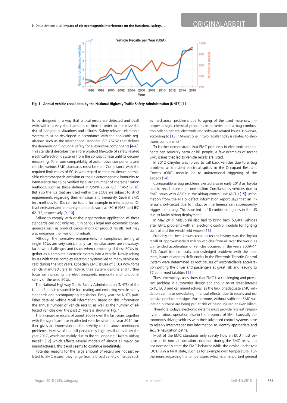 大量召回的潜在原因不仅与EMC问题有关,而且涉及广泛的各种问题,如废旧材料老化造成的机械问题、设计不当、电池和安全气囊燃烧电池中的化学问题,以及一般的电子和软件相关问题。然而,据[13]“今天几乎每两次召回中就有一次与电子元件有关”。
