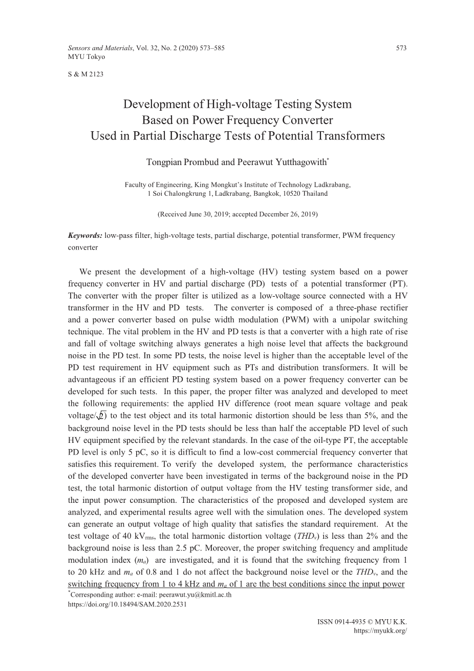 本文介绍了基于高压变频器的高压(HV)测试系统的开发以及电压互感器(PT)的局部放电(PD)测试。带有适当滤波器的转换器在HV和PD测试中用作与HV变压器连接的低压源。该转换器由一个三相整流器和一个基于脉宽调制(PWM)并采用单极开关技术的功率转换器组成。HV和PD测试中的关键问题在于,电压开关的上升和下降速率很高的转换器始终会产生高噪声电平,从而影响PD测试中的背景噪声。在某些局部放电测试中,噪声水平高于高压设备(如PT和配电变压器)中局部放电测试要求的可接受水平。如果可以开发基于功率变频器的高效PD测试系统进行此类测试,将是有利的。本文对适当的滤波器进行了分析和开发,以满足以下要求:对测试对象施加的HV差(均方根电压和峰值电压/2)及其总谐波失真应小于5%,并且PD测试中的背景噪声水平应小于相关标准规定的此类HV设备的可接受PD水平的一半。在油型PT的情况下,可接受的PD水平仅为5pC,因此很难找到一种满足此要求的低成本商用变频器。为了验证开发的系统,已对开发的 转换器的性能特性进行了研究,包括PD测试中的背景噪声,HV测试变压器侧的输出电压 的总谐波失真以及输入功耗。分析了该系统的特点,实验结果与仿真结果吻合较好。开 发的系统可以产生满足标准要求的高质量输出电压。在40kV均方根的测试电压下,总谐波失真电压(THDv)小于2%,背景噪声小于2.5pC。此外,研究了合适的开关频率和振幅调制指数(ma),发现从1到20 kHz的开关频率以及ma为0.8和1不会影响背景噪声电平或噪声。自输入功率以来,从1到4 kHz的开关频率和ma为1是最佳条件而且消费是最低的。此外,已开发的系统已经在实际PT的部分测试中进行了测试,并且发现是可行的。凭借其令人鼓舞的性能,开发的系统是用于HV和PD测试的诱人选择。