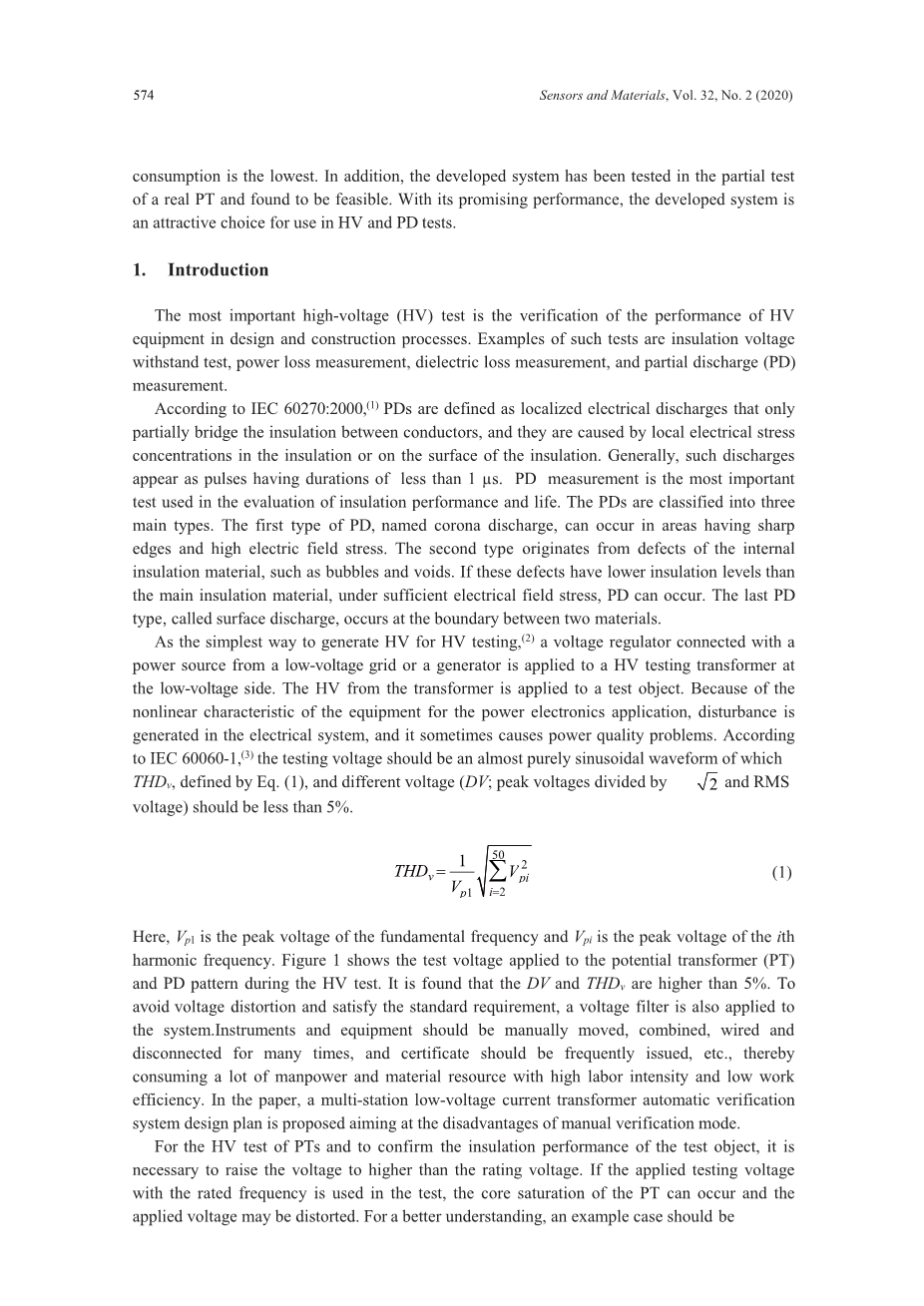 这里,Vp1是基频的峰值电压,Vpi是第i谐波频率的峰值电压。图1显示了在HV测试期间施加到电压互感器(PT)和PD模式的测试电压。发现DV和THDv高于5%。为避免电压失真并满足标准要求,系统上还安装了电压滤波器,仪器和设备应手动移动,组合,接线和断开多次,并应经常颁发证书等,从而消耗了人力和物力资源丰富,劳动强度高,工作效率低。针对手动验证方式的弊端,提出了一种多站式低压电流互感器自动验证系统的设计方案。