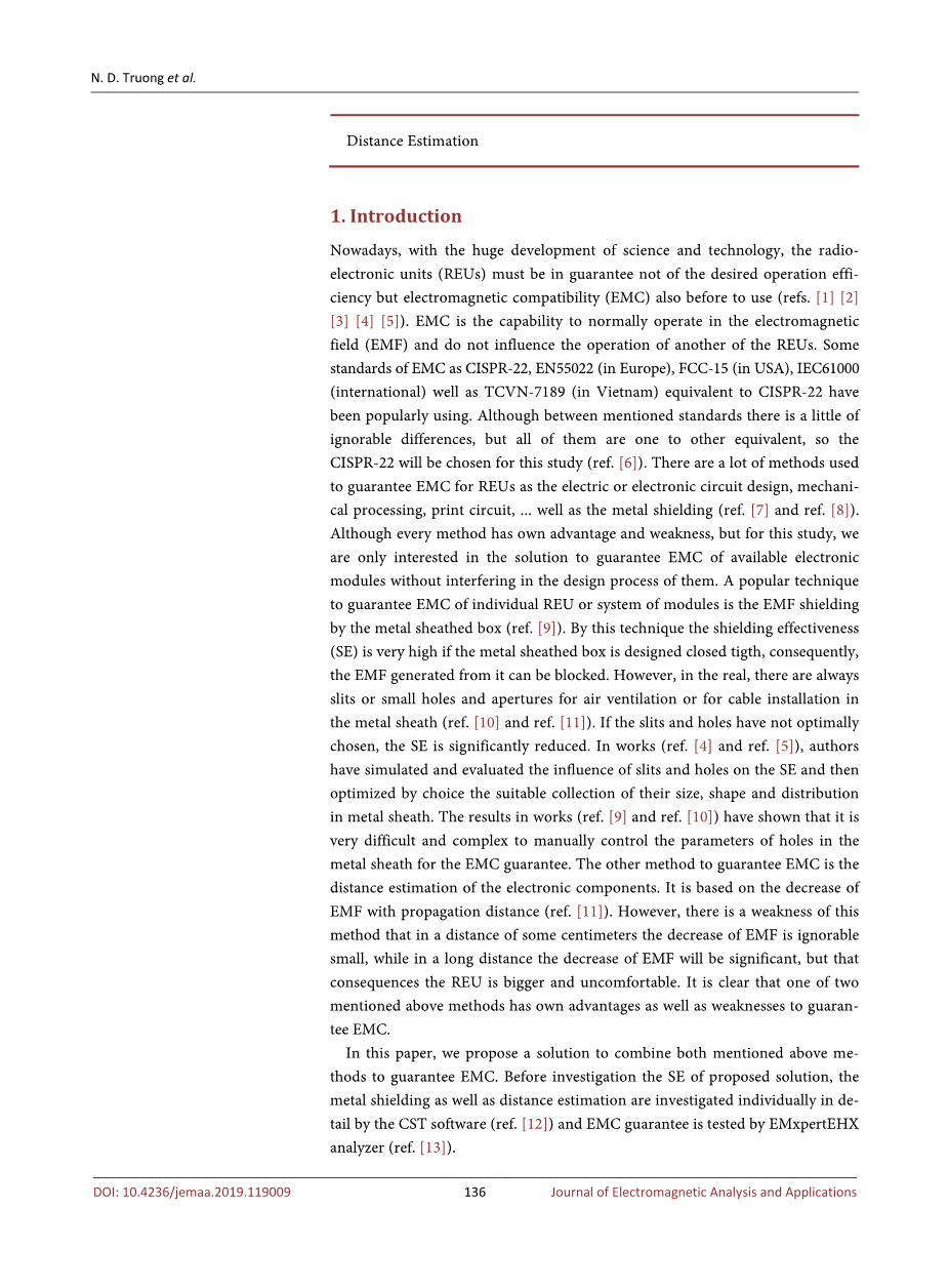 如何引用本文: Truong, N.D., Van N ghia, T., Chinh, B.D.和Quy, H. Q.( 2019)结合金属屏蔽和距离估计 电磁兼容性保证。 《电磁分析与应用杂志》, 11,135-147.