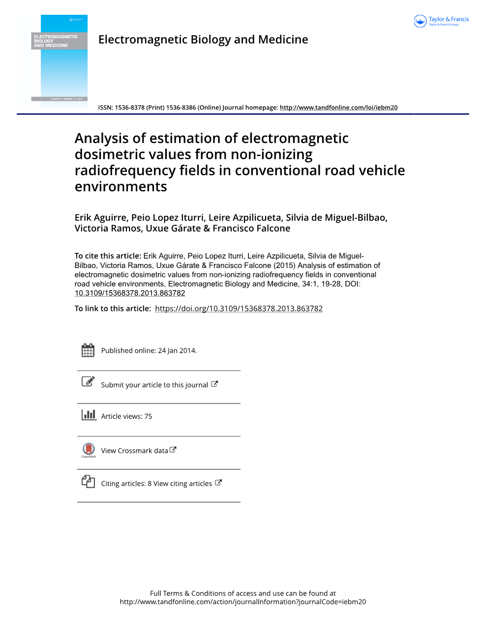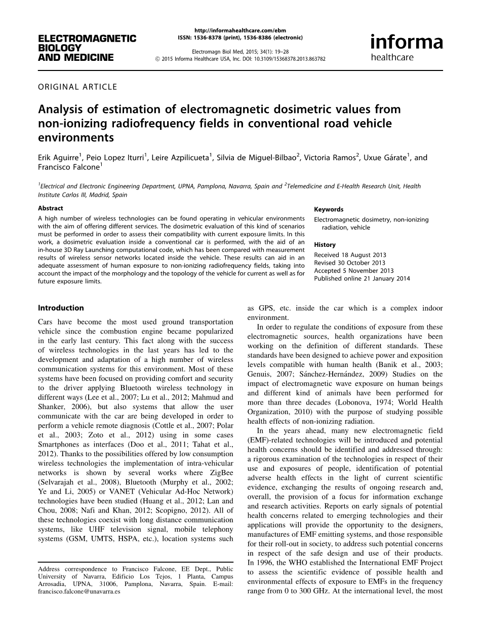 在该工作中,使用内部开发的3D射线发射(RL)代码来计算由三个无线通信系统(ZigBee,GSM和UMTS)产生的电场,以在车辆的整个体积内进行估计。这种方法已经在几个工作中进行了测试,其中模拟了飞机等复杂场景(Aguirre等,2013),在低处理时间内取得了良好的效果。使用剂量计和RF频谱分析仪测量了模拟的车辆情景,允许在理论值和测量值之间进行比较。