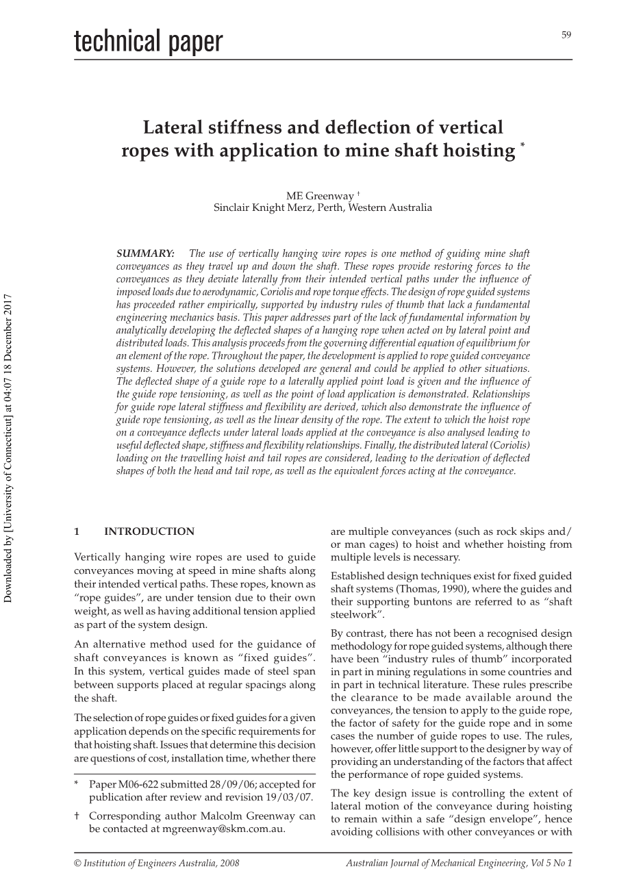 小结:垂直悬挂钢丝绳是导矿竖井的一种方法。当它们上下移动时的运输工具。这些绳索为当交通工具在由于气动、科里奥利和钢丝绳扭矩效应而施加的载荷。绳索导向系统的设计在缺乏基本经验的行业经验法则的支持下,进行了相当经验性的研究。工程力学基础。本文通过以下方法解决了部分缺乏基本信息的问题:分析发展了悬索在横向点作用下的偏转形状。分布荷载。这个分析是从平衡的控制微分方程出发的。绳子的一部分。本文将此项技术应用于钢丝绳导向运输中。系统。但是,所开发的解决方案是通用的,可以应用于其他情况。给出了导绳在横向作用点载荷作用下的变形形状,并给出了导绳在横向作用点载荷作用下的弯曲变形。介绍了导绳张紧的原理和加载点。关系导出了导绳的横向刚度和弯曲度,并证明了导绳横向刚度和弯曲度的影响。导绳张紧,以及绳线密度。起重钢丝绳的长度分析了在横向荷载作用下,运输过程中的挠度,得出:有用的变形、刚度和弯曲关系。最后,分布横向(科里奥利)考虑了移动式提升机和尾绳上的载荷,从而得出偏差头绳和尾绳的形状,以及作用于输送装置的等效力。