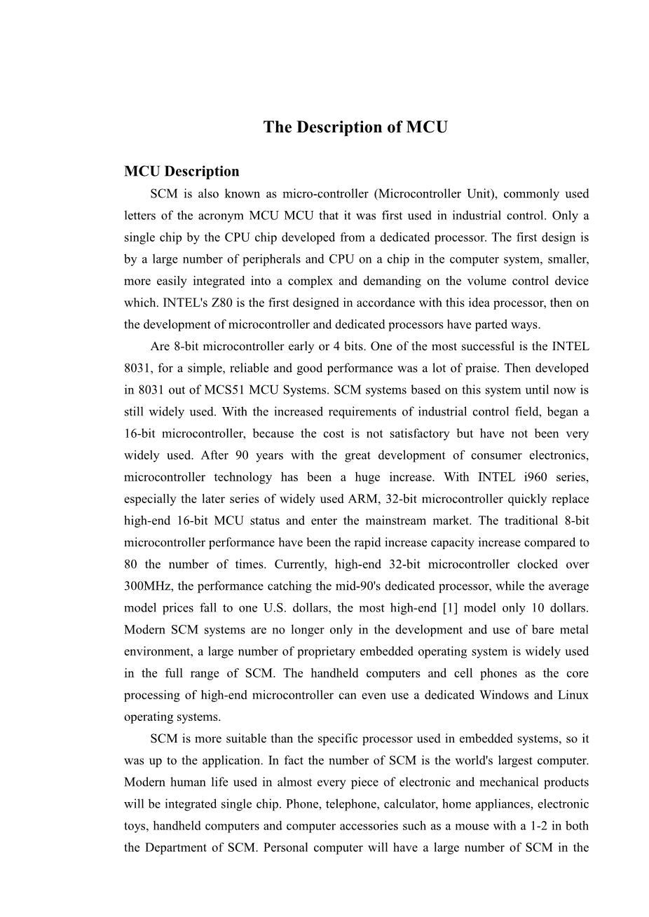 2.MCU即微控制器(Micro Controller Unit)阶段,主要的技术发展方向是:不断扩展满足嵌入式应用时,对象系统要求的各种外围电路与接口电路,突显其对象的智能化控制能力。它所涉及的领域都与对象系统相关,因此,发展MCU的重任不可避免地落在电气、电子技术厂家。从这一角度来看,Intel逐渐淡出MCU的发展也有其客观因素。在发展MCU方面,最著名的厂家当数Philips公司。