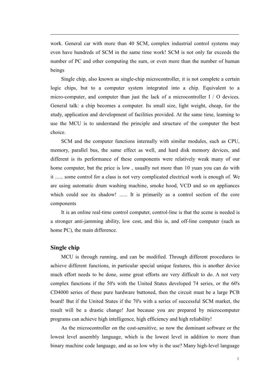 可以说,二十世纪跨越了三个“电”的时代,即电气时代、电子时代和现已进入的电脑时代。不过,这种电脑,通常是指个人计算机,简称PC机。它由主机、键盘、显示器等组成。还有一类计算机,大多数人却不怎么熟悉。这种计算机就是把智能赋予各种机械的单片机(亦称微控制器)。顾名思义,这种计算机的最小系统只用了一片集成电路,即可进行简单运算和控制。因为它体积小,通常都藏在被控机械的“肚子”里。它在整个装置中,起着有如人类头脑的作用,它出了毛病,整个装置就瘫痪了。现在,这种单片机的使用领域已十分广泛,如智能仪表、实时工控、通讯设备、导航系统、家用电器等。各种产品一旦用上了单片机,就能起到使产品升级换代的功效,常在产品名称前冠以形容词——“智能型”,如智能型洗衣机等。现在有些工厂的技术人员或其它业余电子开发者搞出来的某些产品,不是电路太复杂,就是功能太简单且极易被仿制。究其原因,可能就卡在产品未使用单片机或其它可编程逻辑器件上。