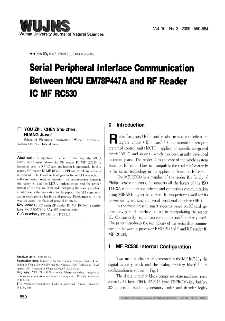 目前提出了单片机EM78P447A操纵基于MF-RC530的IC射频读卡器的用于射频IC卡的应用的功能的一个重要方法。在本文中介绍了基于MF-RC530的IC射频读卡器的SPI兼容接口。内核技术包括在IC读卡器和单片机之间的SPI连接,软件设计,启动注册和请求-响应,解释身份验证和适当的关键格式。本文创新的采用了串行外围接口。SPI通信模式被证明是可行的和精确的。此外,我们应该避免滥用并行接口的方式。