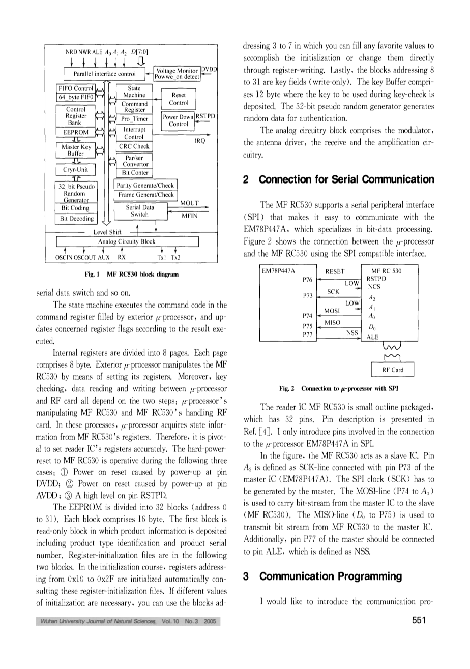 MF RC530支持串行外围接口(SPI),这使它容易与EM78P447A专门进行位数据处理的通信。图2显示了mu;处理器和使用SPI兼容接口的MF RC530之间的联系。