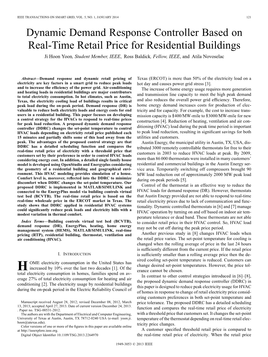 美国国内的家庭电力消费量,在过去的二十年里增长了10% [ 1 ]。在家庭总用电,家庭平均消费的总用电量的27%用于取暖和空调[ 2 ]。住宅建筑的电力使用在电力可靠性委员会的高峰期期间。Manuscript received August 28, 2012; revised December 08, 2012, March