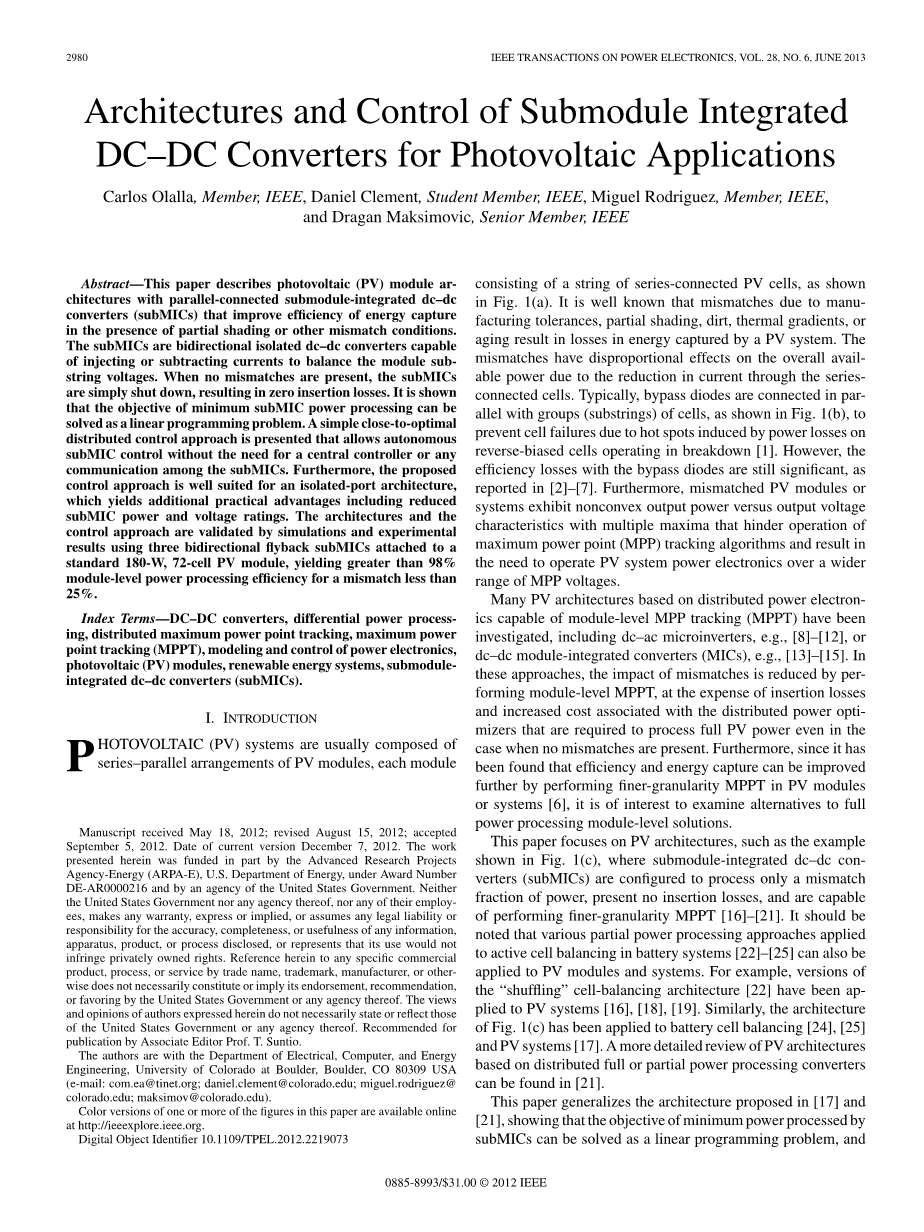 索引词汇:直流-直流变换器,微分功率处理,分布式最大功率点跟踪,最大功率点跟踪(MPPT),建模和电力电子器件的控制,光伏(PV)模块,可再生能源系统,子模块集成直流-直流变换器(subMICs)。