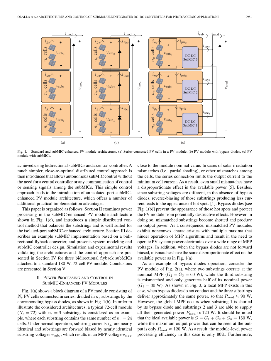 本文安排如下。第二部分探讨了增强型子模块集成的直流-直流转换器的光伏模块架构中的功率处理问题,如图1(c)所示。并引入了一种可以平衡子串和非常适合独立端口增强型子模块集成的直流-直流转换器结构的简单的分布式控制方法。第三节描述了一个基于双向反激变换器而实现子模块集成的直流-直流转换器的例子,并提出系统建模和子模块集成的直流-直流转换器的控制器设计。仿真和验证体系结构和控制方法的实验结果将在第四节给出,其中三个双向反激式subMICs连接到一个标准的单晶180W,72片电池的光伏组件上。结论将在第五节给出。