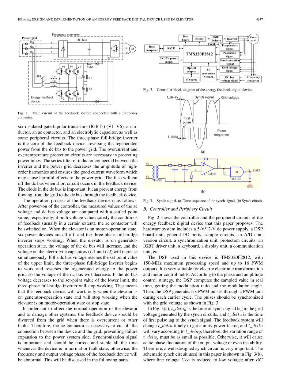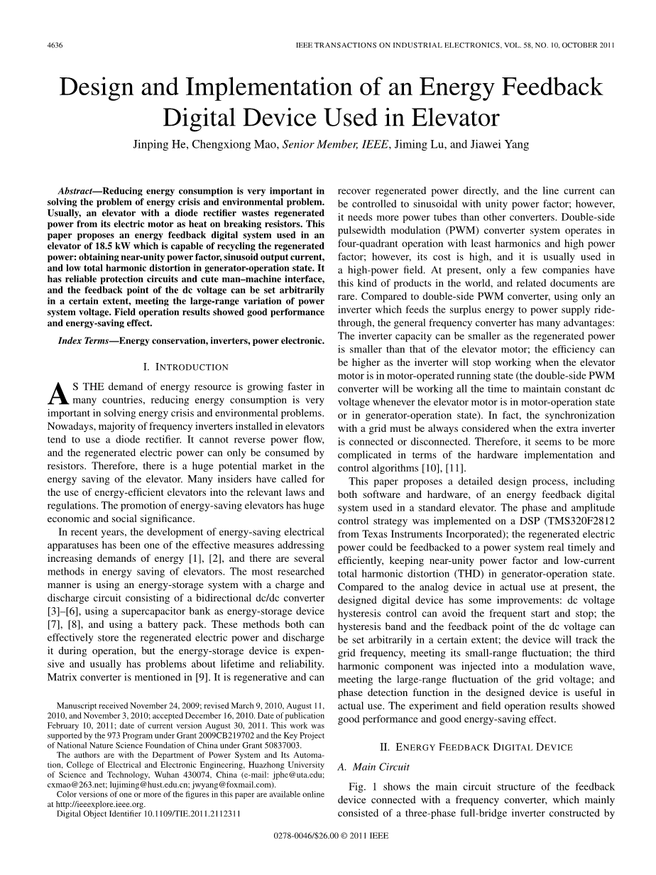 在最近的几年中,节约能量的电力仪器的发展已经对有效能量节约的措施需求,有了很大的响应。并且这儿有许多用于电梯节约能量的方法。其中最有效的方式就是使用能量存储系统,它具有一个双向的直流-直流转换器的充电放电的电路。使用一个超级电容容器作为 能量储存的设备。并且使用了一个电池包。这些方法不仅可以有效的把产生的电力能量存储起来,也可以在操作的时候释放出来。但是这些能量存储的器件都很昂贵,并且通常还有使用时间和可靠性的问题。矩阵转换器在上述[9]。它是可再生的,并且可以直接恢复再生的能源,并且线电流可以由具有单位功率因数控制并成为正弦波。然而,它需要比其它变换器更多的功率管。双极型脉宽调制(PWM)变换器系统工作在四象限内,并且具有最低的谐波和高的功率因素。然而它的消耗得太多了,并且它常常运用在高功率的场合。现在,在这个世界上,只有较少的公司具有这种产品,并且相关的文件也非常罕见。相比较于双极型PWM变换器,使用只有一个向功率提供通过的馈送剩余能量的逆变器,一般频率的变换器有许多优点:可以像再生能量的容量一样小的逆变器要比电梯电机要更小;高效性和逆变器一样高,这将会在电机工作在电机模式状态下运行时停止工作(双极型PWM变换器将一直工作着以维持持续的直流电压,无论在电机工作在电机工作状态还是在发电机工作状态)。事实上,当额外的逆变器连接或者断开电网时,与电网的同步必须时刻考虑到。因此,这似乎关系到更多的复杂的硬件运用和算法的控制。这篇文章提出了设计运用在一个标准电梯能量回馈的数字系统过程中的细节,包括了软件和硬件方面上的,相位和幅值的控制策略是基于DSP的;再生的电力能源将可以实时的高效的回馈到一个电力系统中去,在发电机工作状态下,保持着接近单位的功率因素和低的电流总谐波失真(THD)。相比较于现在事实在使用的类似的仪器,设计的数字一起有一些改进:直流电压的滞后控制可以避免在频率的开始和结束的时候;直流电压的滞后段和回馈点可以在一定的程度上任意的设定;这个仪器将会追踪电网的频率,并且符合它小范围的波动;其中第三方的危害器件已经植入到调制波中,符合了电网电压的大范围波动;并且在这个仪器中设计的相位方向的功能对实际的应用中也有很大的帮助。实验和实际操作的结果有一个很好的表现,并且有一个很好的节约能量的效果。