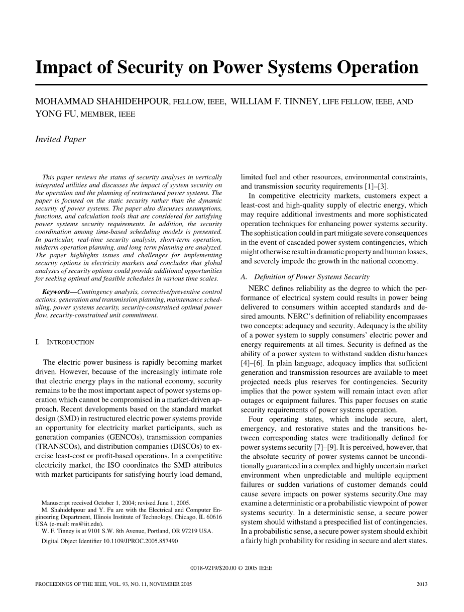关键词:事故分析,纠正/预防措施,发电和输电计划检修计划,电力系统的安全性,安全约束的最优潮流,安全装置