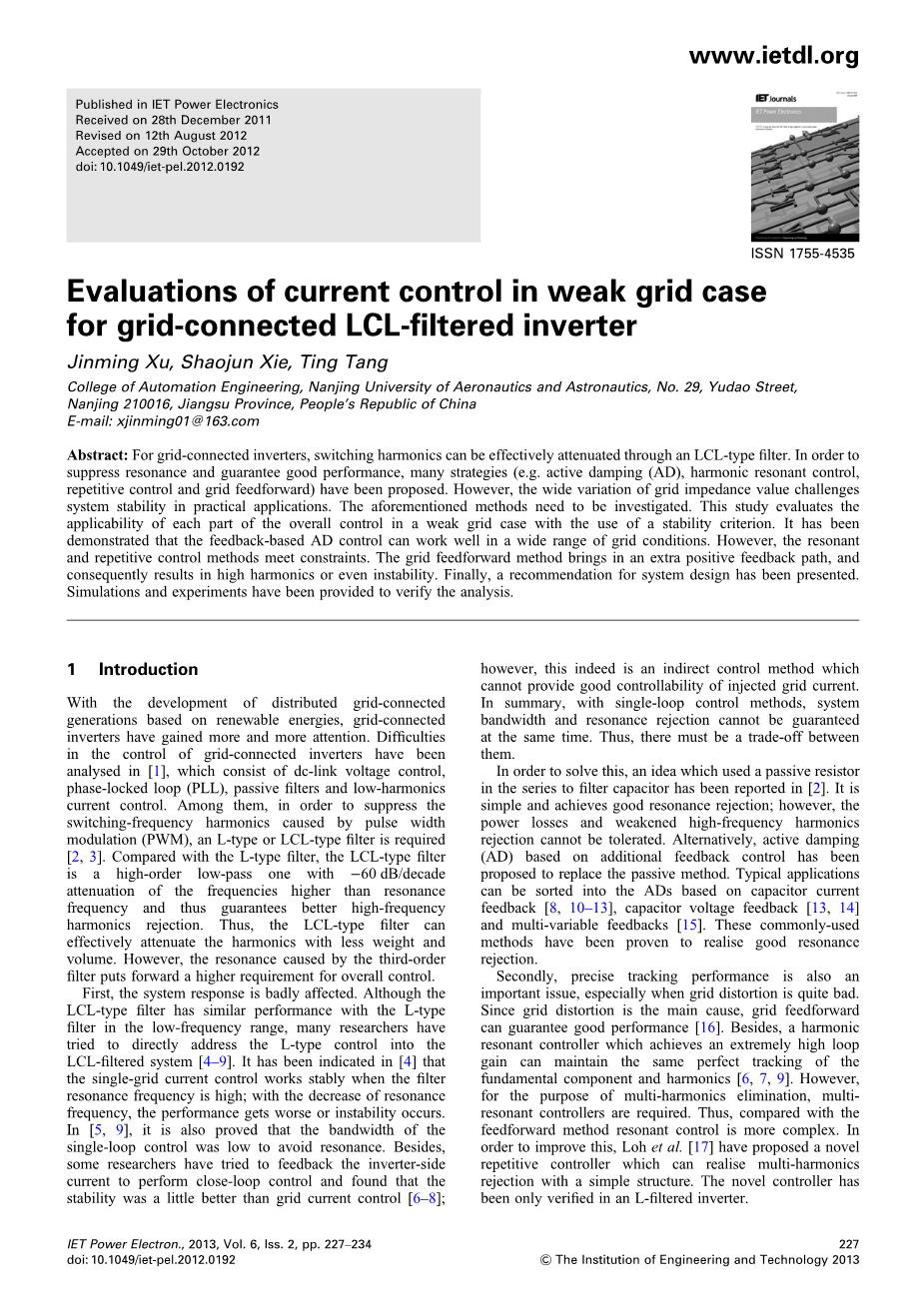 上述研究证明现有的LCL型逆变器在一个僵硬的网格情况下可以实现令人满意的性能。AD控制,可以高度衰减共振,重复控制或网格前馈,谐波电流引起的网格畸变。然而,在实际应用中,由于大量的分布式发电,远距离输电电线和变压器、电网从公共连接点(PCC)的意义实际上有大量感应阻抗[6]。在这种情况下,弱电网情况可能挑战系统稳定性和控制设计。