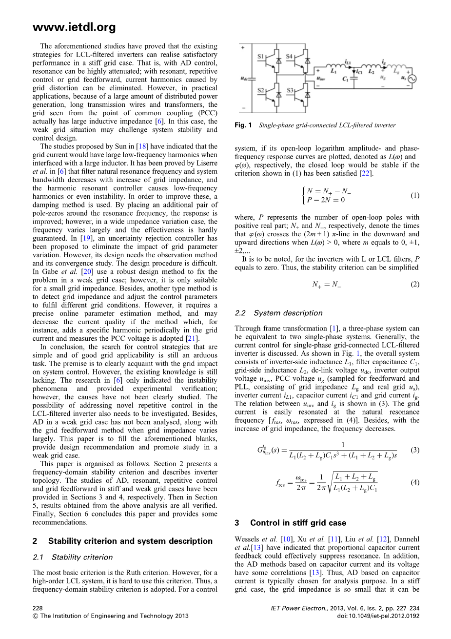 总之,寻找控制简单和良好的电网适应性的策略仍然是一个艰巨的任务。前提是明确熟悉网格对系统控制的影响。然而,现有的知识仍然缺乏。[6]的研究只表明所提供的不稳定现象和实验验证;然而,原因显然没有被研究。解决的可能性LCL滤波器重复控制逆变器也需要调查。除此之外,AD在弱电网情况下没有分析,随着网格前馈方法当电网阻抗变化大。本文旨在填补上述空白,提供设计建议,促进研究弱电网的情况。