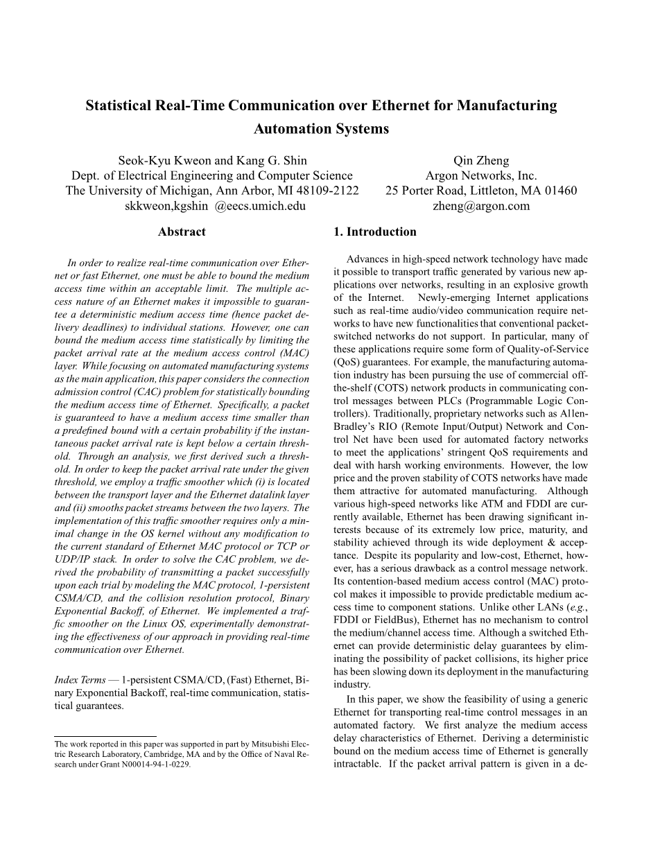在本文中,我们展示了使用一个通用的以太网在一个自动化工厂传输实时控制消息的可能性。我们首先分析以太网的介质访问延迟特性。推导一个以太网介质访问时间的确定界限一般是棘手的。如果数据包到达模式是de-terministic形式,可能派生出我们想要的界限,但它是没有价值的,因为来自最坏的交通场景的延迟界限非常大,即使是非常轻的负载条件下。根据1-persistent CSMA / CD的MAC协议,那些经历过碰撞的数据包在重发时可能会经历更多的碰撞,在最坏的情况下,一旦两个包相互碰撞,如果碰撞15次将被丢弃。所以,延迟界限的导出使用最坏的情况来分析是没用的。因此我们想得出一个有意义的(例如,统计性的) 以太网通道访问时间界限,在一些输入通信和其MAC协议功能的合理假设下。具体来说,我们分析得出统计界限之间的关系和相应的允许输入电平。通过这个分析,我们可以获得实现统计性的以太网实时通信的CAC。我们的分析考虑1-persistent CSMA / CD的MAC协议,它目前采用用于以太网的二进制指数倒扣(BEB)策略。