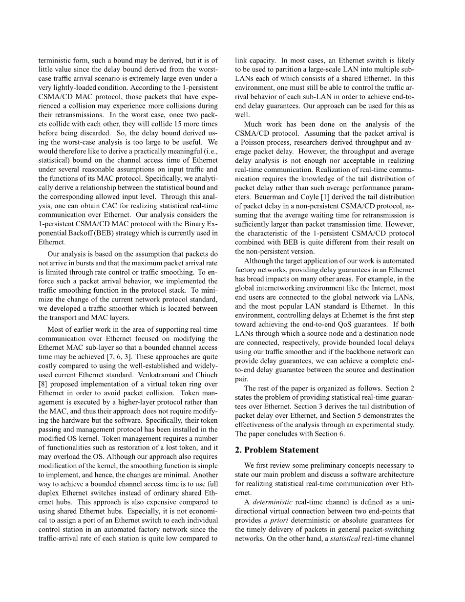 剩下的文章组织如下。第二节讨论在以太网提供统计性实时担保的问题。第三节给出在以太网中包延迟的最终分布,第五节演示了通过一个实验分析有效性。第六部分是本文结尾。