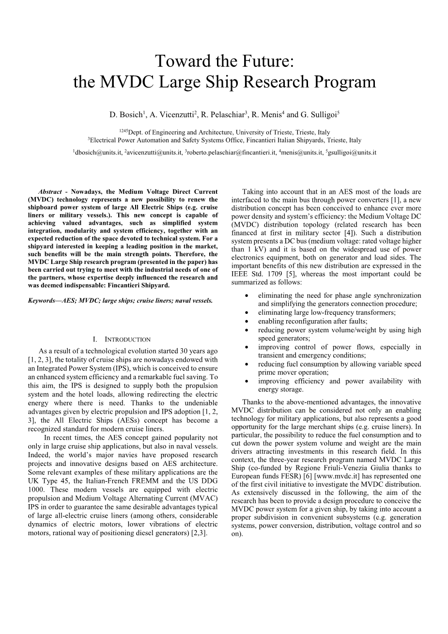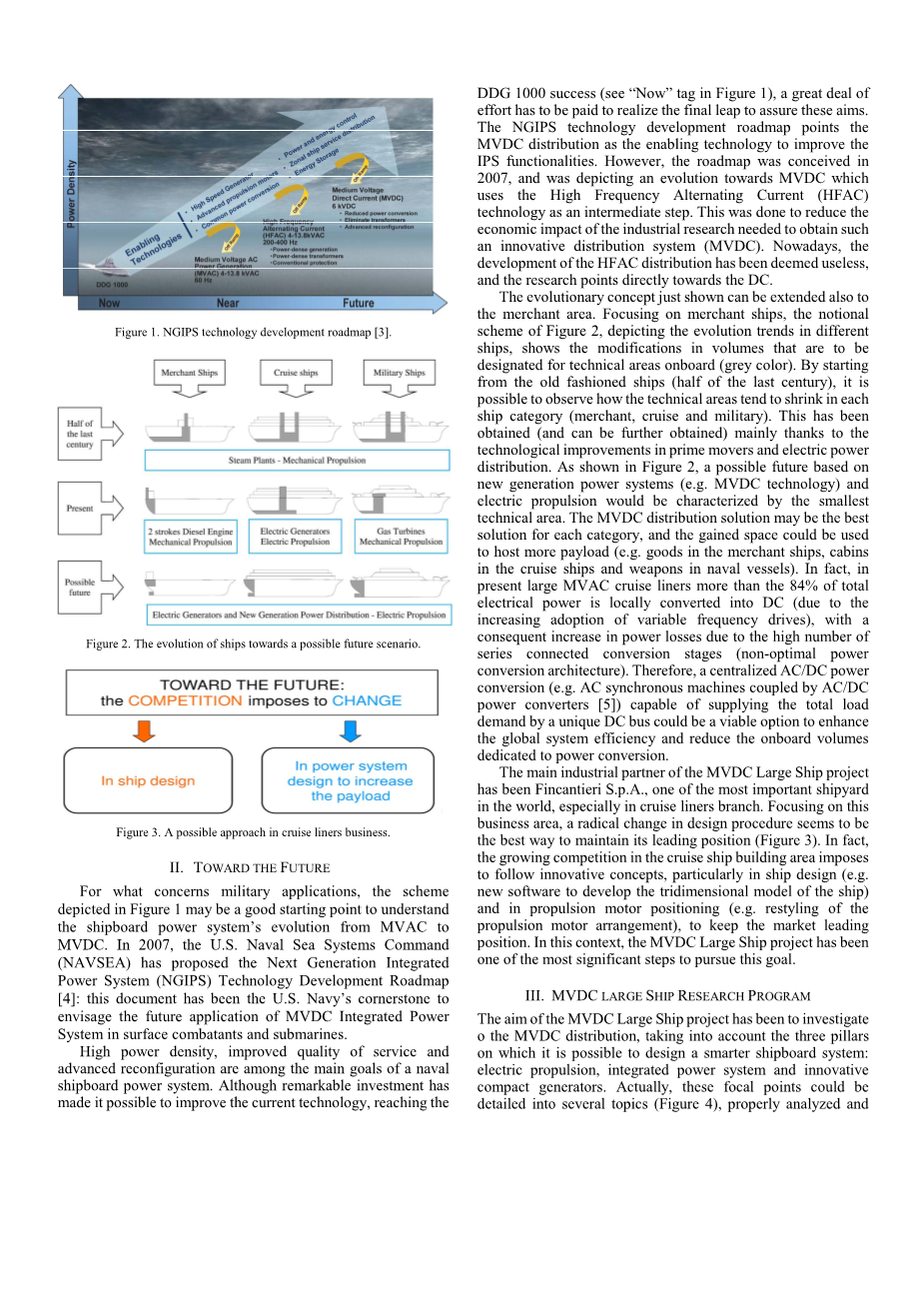 鉴于上述优点,创新的中压直流配电不仅被认为是可以用于军事应用的一项可靠技术,而且还是大型商船(例如邮轮)发展的良好机会。特别是在减少燃料消耗和减少动力系统体积和重量方面,成为吸引对这个研究领域的投资的主要驱动力。在这方面,名为“中压直流大型船舶”的三年研究计划(由欧洲基金FESR,弗吉利亚 - 威尼斯朱利亚共同资助)[6]代表了对中压直流配电的第一个民事计划。正如以下具体讨论的,研究的目的是通过对子系统(例如发电系统,电力转换,分配,电压控制等)的研究,为船载中压直流电力系统提供一个设计方案。