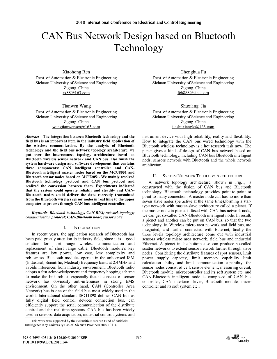 近年来,蓝牙技术的应用研究在工业领域得到了极大的关注,因为它是解决短距离无线通信和替换短距离电缆的好方法。蓝牙模块的主要功能是低功耗、低成本、低复杂度和鲁棒性。蓝牙模块在 2.4 MHz 的无牌 ISM (工业,科学,医疗) 频段中运行,避免了来自工业环境的推论。蓝牙无线电采用快速确认和跳频方案使链路具有鲁棒性,尤其是传感器网络在强 EMS 环境下具有明显的抗推理能力。另一方面,CAN (控制器局域网) 总线是世界上应用最广泛的现场总线之一。国际标准 ISO11898 将 CAN 总线定义为全数字现场总线警用巡检设备连接总线,可以有效地支持分布式控制和实时系统的串行通信。CAN 总线已广泛应用于传感器、数据采集、工业控制