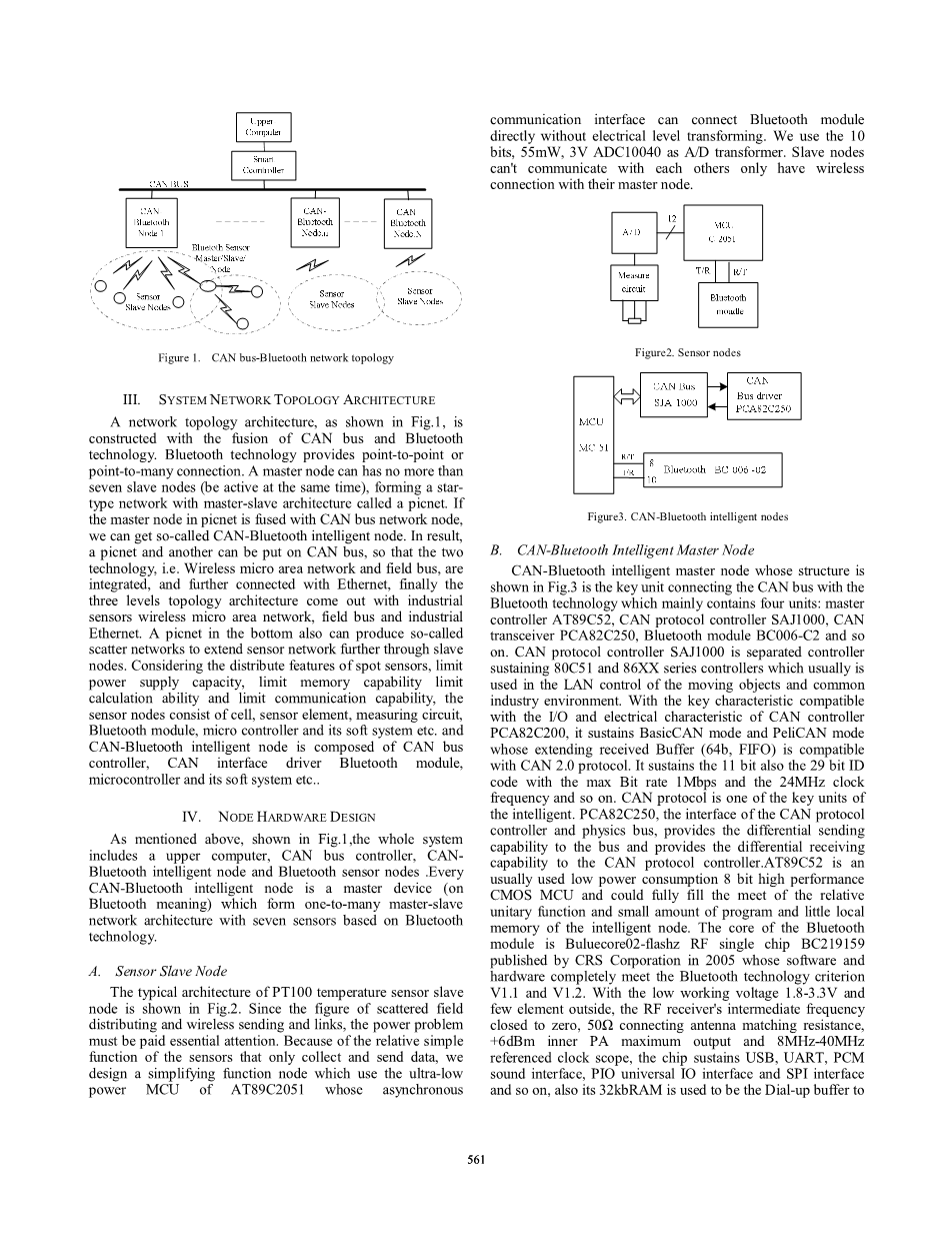 一个网络拓扑结构,如图 1 所示,与 CAN 总线和蓝牙技术的融合构建。蓝牙技术提供点对点或点对多连接。主节点可以不超过七个从属节点 (同时处于活动状态),形成一个星型网络,主从结构称为 picnet。如果 picnet 中的主节点与 CAN 总线网络节点融合,就可以得到所谓的 can-蓝牙智能节点。结果,一个 picnet 和另一个可以放在 can 总线,使这两种技术,即。无线微区网络与现场总线进行集成,并进一步与以太网连接,最后提出了工业传感器无线微区网络、现场总线和工业以太网的三层拓扑结构。在底部的 picnet 也可以产生这样的-calLed 散射网络通过从节点进一步扩展传感器网络。考虑到现场传感器的分布特性、极限电源容量、极限存储器容量、极限计算能力和极限通信能力,传感器节点由单元、传感器元件、测量电路、蓝牙模块、微控制器及其软系统等。 CAN-蓝牙智能节点由 CAN 总线控制器组成,CAN 接口驱动、蓝牙模块、微掌握器及其软体系等。