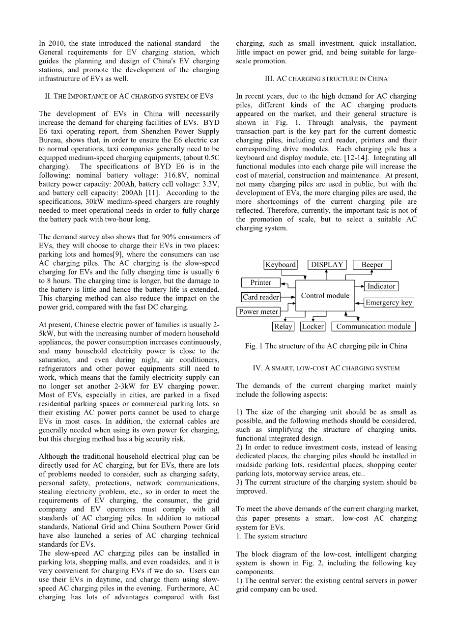 对于电动汽车产业的发展,除了电动汽车的发展问题,我们还需要考虑充电设施建设的问题。本文首先介绍了交流充电桩对于电动汽车发展的重要性。然后,对当前交流充电桩的结构和存在的问题进行了讨论之后,又提出了一个新的电动汽车充电系统,并对其结构组成,功能锁定图,充电付款过程和系统的可靠性进行了详细讨论。通过对现有市场上的交流充电桩的研究,本文提出了一种智能的,低成本的电动汽车交流充电系统,以减少电网公司和执行机构在建设大量电动汽车交流充电桩时候的投资成本。与传统技术相比,该系统具有成本低,占地面积小,低投资的突出特点。