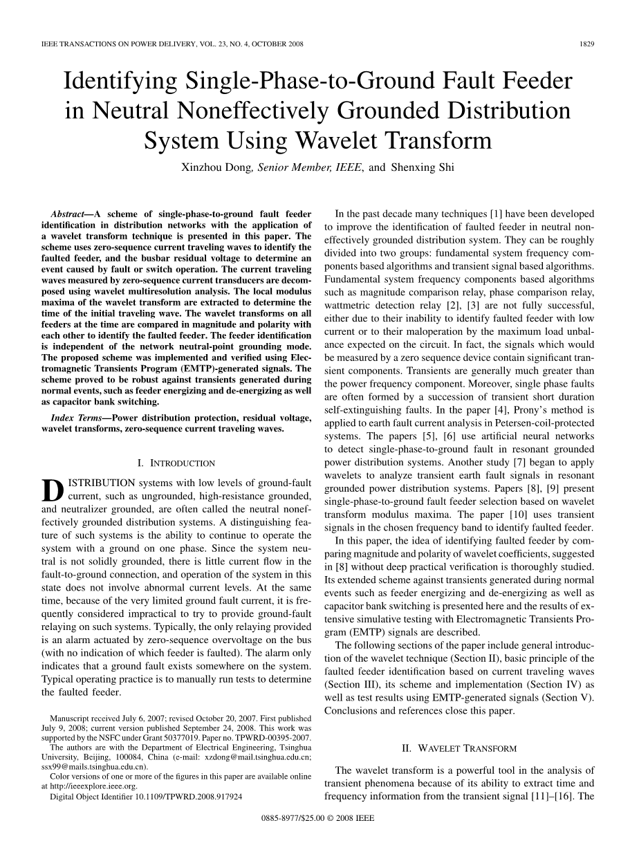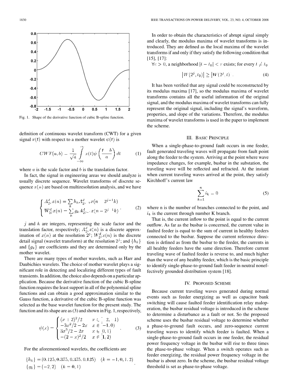 本文接下来的部分包括小波技术(第II节)的一般介绍,基于电流行波的故障馈线识别的基本原理(第III节),其方案和实施(第IV节)以及使用EMTP的测试结果 (第V节)。以结论和参考文献结束本文。