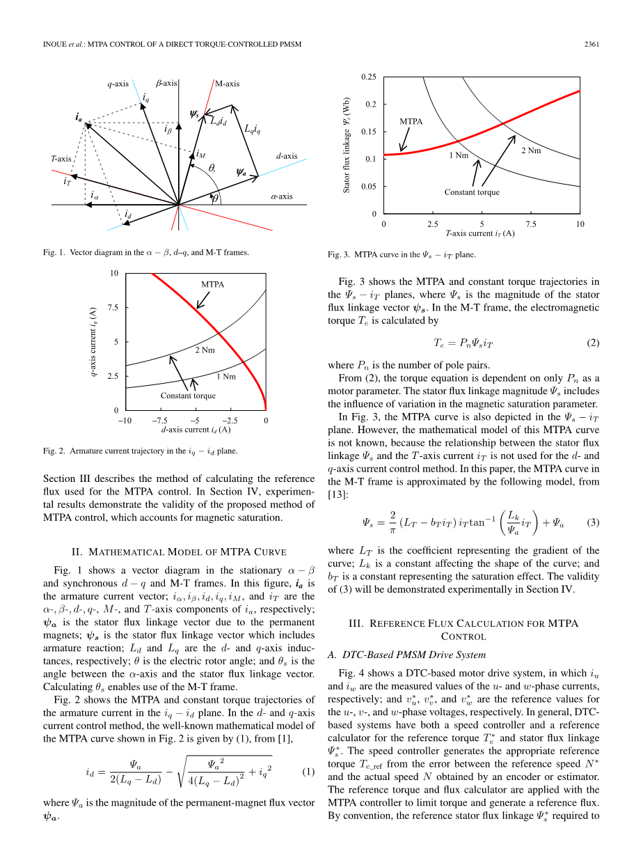 图一显示了在静止alpha;-beta;坐标系、同步d-q坐标系和M-T坐标系下的矢量图,在此图中,是电枢电流矢量,、、、、、分别是在alpha;轴、beta;轴、d轴、q轴、M轴、T轴上的分量,是由永磁体产生的定子磁链矢量,是包括电枢反应的定子磁链矢量,和分别是d轴和q轴的感应系数,theta;是转子电角度,是alpha;轴和定子磁链矢量的夹角,计算可以使用M-T坐标系。图2显示了MTPA和电枢电流在-平面的恒转矩轨迹,在d、q轴电流控制方式中,在图2中最著名的MTPA曲线数学模型得自[1],从[1]有