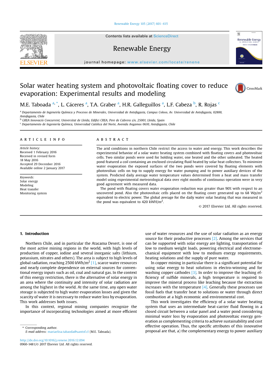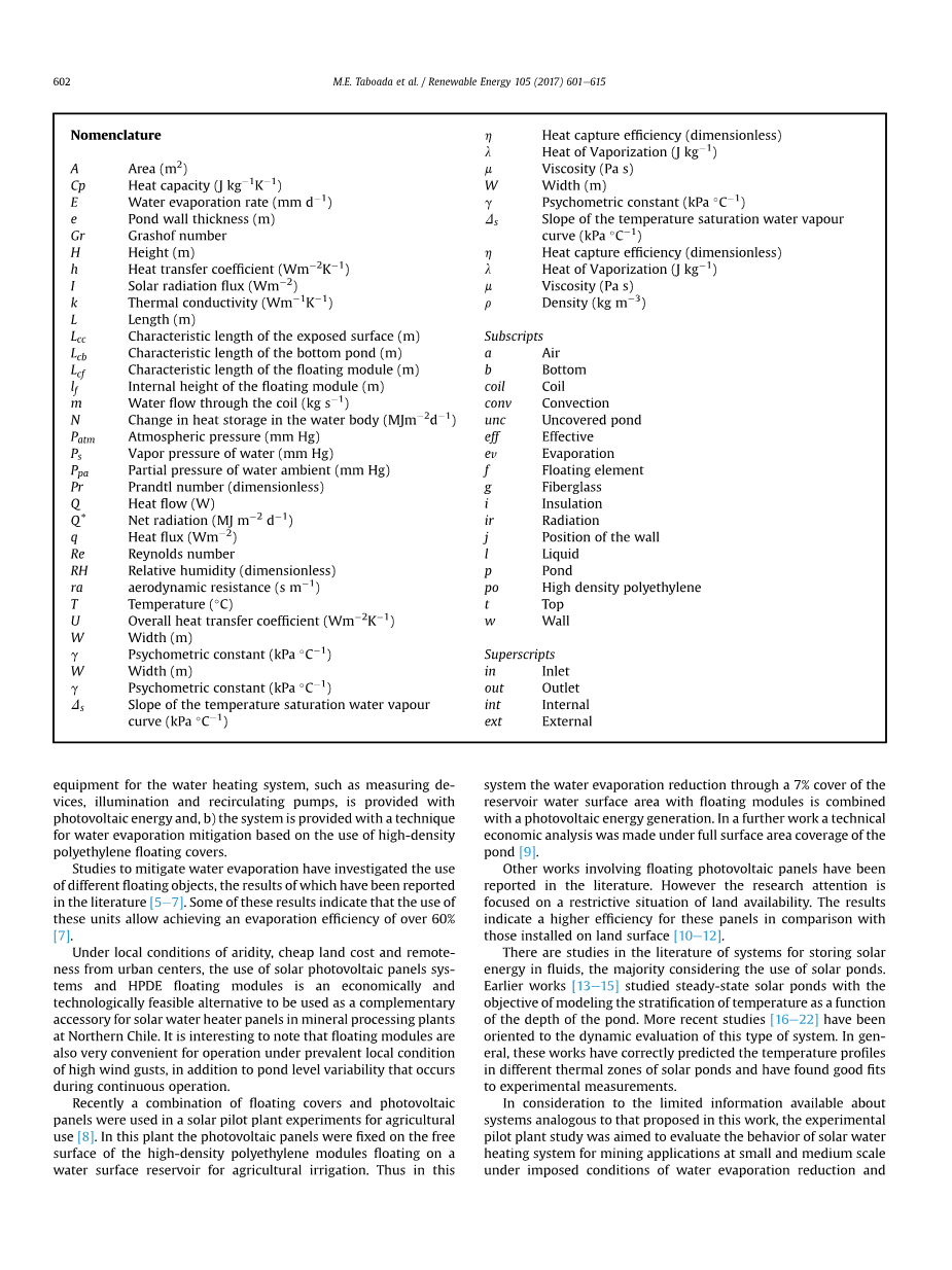 由于智利北部的干旱条件限制了水和能源的获取,这份报告描述了利用太阳能热水系统结合浮动盖和光伏电池解决相关问题的实验记录。实验选取两个相同的含有被太阳能集热器加热的封闭循环流体盘管的池塘用于储水,对其中一个加热,另一个不加热。为了使水蒸发量最小化,两个池塘与空气接触的表面被顶部的光伏电池覆盖,以提供用于水泵和系统辅助装置的能量。依据8个月的连续操作中的实验气象数据的热量传递模型,实验结果证明预测日平均水温值与测量数据保持高度一致。相对于未覆盖的池塘,具有浮动覆盖物的池塘水减少了超过90%的蒸发量。 此外,放置在浮动盖上的光伏电池产生的能量转换到电功率高达68Wp / ,且在池塘中测量的每日水太阳能加热的全球平均值为420 kWH / 。