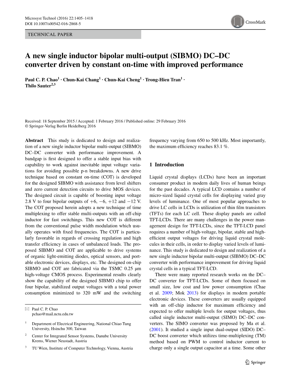 在现代日常生活中,人类在过去几十年里,液晶显示器(LCD)一直是重要的消费产品。典型的LCD包含多个用于显示变化灰度的微尺寸液晶单元亮度水平。最受欢迎的方法之一是利用薄膜晶体管(TFT)制造LCD中的驱动LC单元。这些显示面板被称为TFT-LCD。TFT-LCD的老化设计中存在很多电力管理的问题,因为TFT-LCD面板需要多个高压,双极,稳定,高效输出电压来驱动单元中的液晶分子,以显示不同水平的亮度。本研究致力于设计和实现一个在典型的TFT-LCD中具有性能改进的驱动液体晶体单元的新型单电感器双极多输出(SIBMO)DC-DC转换器。