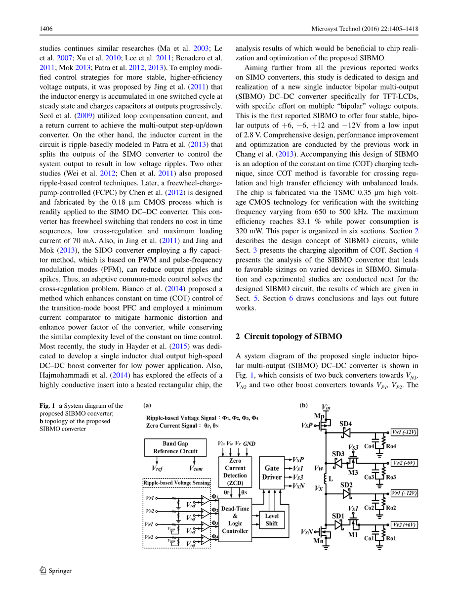 有许多报告正在研究DC-DC转换器。其中一些关注)用于现代便携式显示器电子设备的小尺寸,低成本和低功耗转换器(Chaeet al。 2009; Mok 2013。这些转换器为了实现最大效率并输出多电压,通常配备有片外电感器,因此称为单电感器多输出(SIMO)DC-verters。 SIMO转换器由Ma等人提出(2001)。他们研究了单输入双输出(SIDODC-DC升压转换器,其基于PWM的方法来控制电感电流以利用时间多路复用(TM)的方式一次只对单个输出电容器充电。其他报告继续了类似的研究(Ma et al。2003;et al。 2007; Xu et al。 2010; Lee et al。 2011; Benadero et al。2011; Mok 2013; Patra et al。 2012,2013)。为了使用改进的控制策略以输出更稳定高效的电压,Jing等提出(2011)电感能量在稳态下在一个开关周期内被累积并逐渐对输出电容器充电。Seol et al(2009)利用环路补偿电流,实现多输出升压/降压的返回电流转换器。另一方面,在Patra et al。 (2013)报告中电感电流在电路是基于纹波的模型分割SIMO转换器的输出以控制系统输出以产生低电压纹波。另外两个研究(Wei et al。2012; Chen et al。2011)也提出基于纹波的控制技术。随后,泵控制(FCPC) (2012)被设计出来,它通过0.18mu;mCMOS工艺制造,并普遍应用于SIMO DC-DC转换器。这个转换器具有自由切换的优点,因此可以无需时间序列成本,实现低交叉调节和最大负载电流70 mA。此外,在Jing et al(2011),Jing和Mok(2013)的研究中,SIDO转换器在基于PWM和脉冲频率调制模式(PFM)上,采用飞电容方法,这样可以减少输出纹波峰值。因此,自适应共模控制解决了交叉调节问题。 Bianco et al(2014)提出一个方法,通过增加控制过渡模式的恒定导通时间(COT)来PFC使升压并采用最小电流比较器以减轻谐波失真和增强转换器的功率因数,同时简化了类似复杂度的恒定导通时间控制。最近,Hayder等人的研究(2015)开发了单电感器双输出高速DC-DC升压转换器,它可以用于低功率应用。同时,Hajmohammadi et al。 (2014)探讨了插入一个加热的矩形芯片的高导电性的影响,分析结果和SIBMO的提出将有利于芯片的可实现性和最优化。进一步从所有以前研究有关SIMO转换器的报告看,本研究致力于设计和实现了新的专用于TFT-LCD的单电感器双极多输出(SIBMO)DC-DC转换器,特别是工作在多个“双极”电压输出。