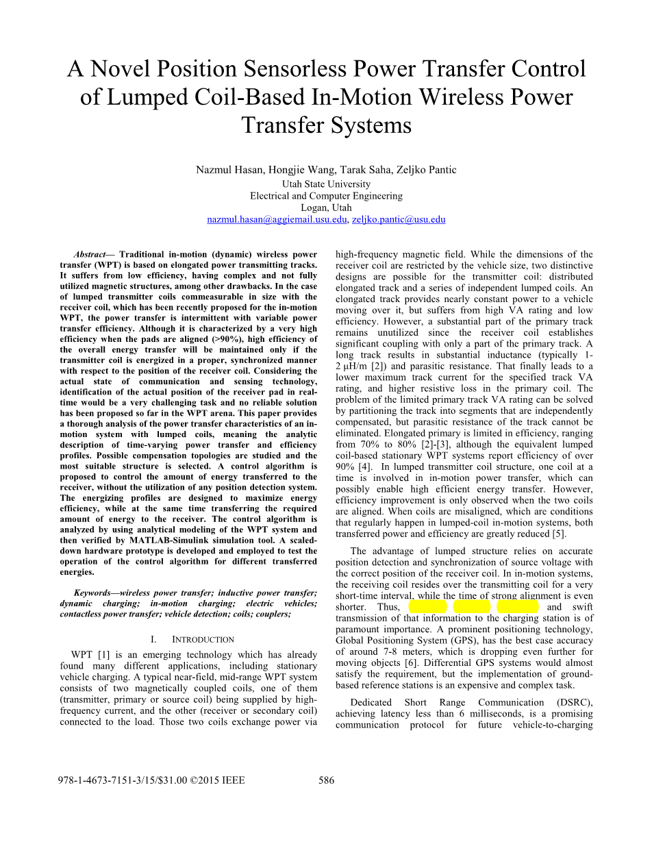 WPT是一种新兴技术,已经发现了许多不同的应用,包括固定车辆充电。典型的近场中频WPT系统由两个磁耦合线圈组成,其中一个(发射机,初级或源线圈)由高频电源提供,另一个(接收机或次级线圈)连接到负载。这两个线圈通过高频磁场交换电能。虽然接收线圈的尺寸受车辆尺寸限制,但是对于发射线圈可以有两种不同的设计:分布的细长轨道和一系列独立的集总线圈。细长的轨道为在其上移动的车辆提供几乎恒定的功率,但会产生高VA等级和低效率。然而,主轨道的主要部分保持未使用,因为接收器线圈仅与主轨道的一部分建立明显的耦合。长轨迹导致大量的电感(通常为1-23uH / m )和寄生电阻。这最终导致针对指定的轨道VA额定值较低的最大轨道电流和在初级线圈中的较高的电阻损耗。有限的初级轨道VA额定值的问题可以通过将轨道分段来解决,但是不能消除轨道的寄生电阻。虽然等效的基于集总线圈的固定WPT系统报告的效率超过90%,但是伸长轨道的效率只有有限的70%到80%。在集总发射线圈结构中,一次一个线圈涉及运动中功率传递,这可能实现高效能量传递。然而,仅当两个线圈对准时才能得到高效率。当线圈不对齐时(这是在集总线圈运动系统中经常发生的情况),传输功率和效率都大大降低。