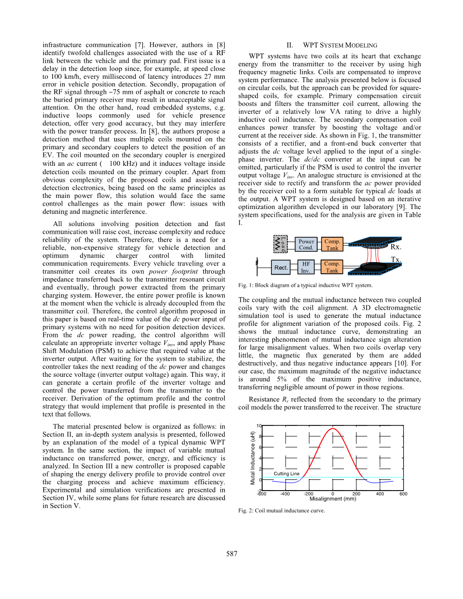 下面介绍的材料组织如下:在第二部分,提出了深入的系统分析,然后解释典型的动态WPT系统的模型。在同一节中,分析了可变互感对传输功率,能量和效率的影响。在第三节中,提出了一种新的控制器,其能够形成能量输送以提供对充电过程的控制并实现最大效率。实验和模拟验证在第四部分,而一些未来研究的计划在第五节讨论。