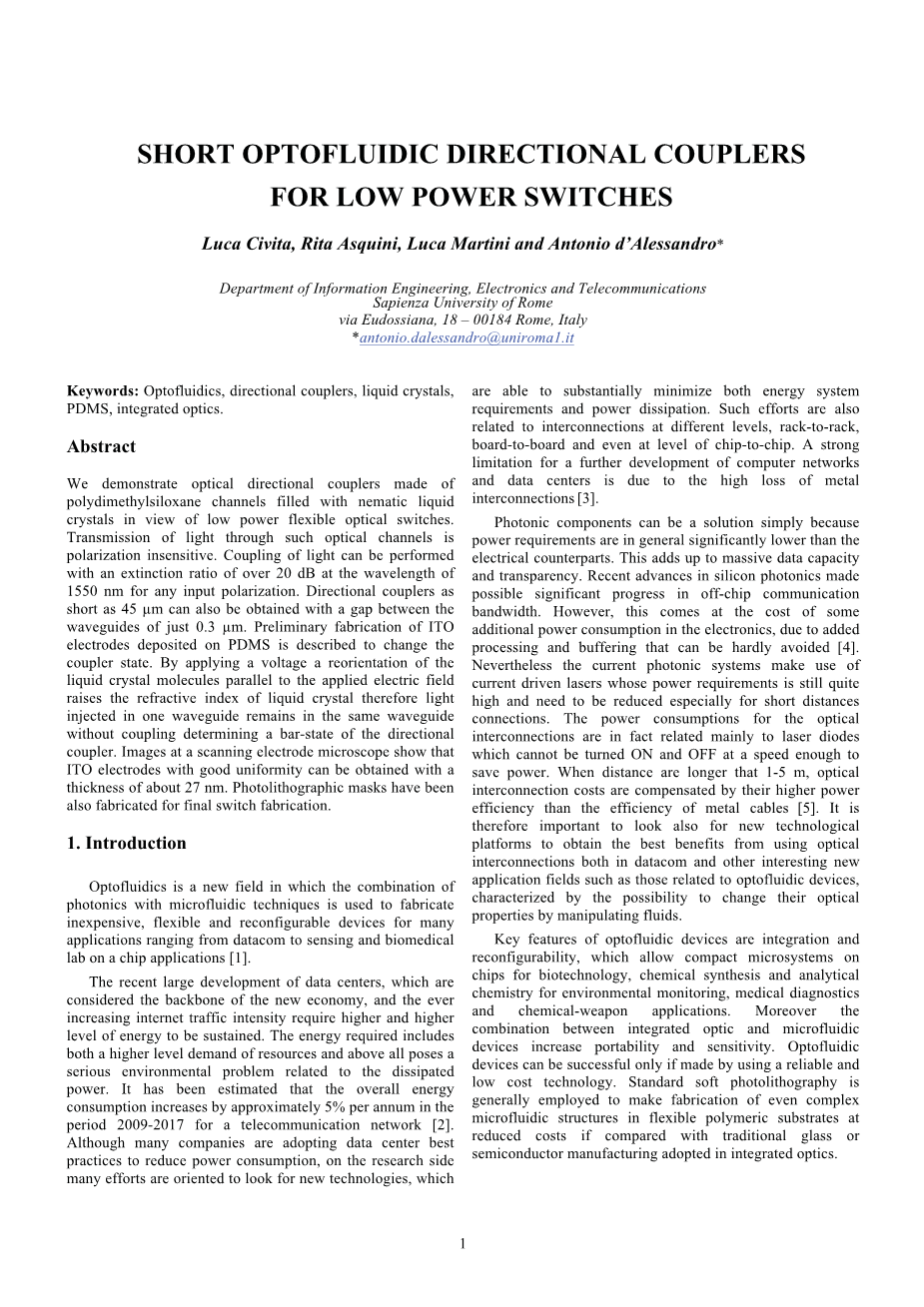 [7] Donisi, D., Bellini, B., Beccherelli, R., Asquini, R., Gilardi, G., Trotta, M., and drsquo;Alessandro, A., “A switchable liquid-crystal optical channel waveguide on silicon”, IEEE J. Quantum Electron., 2010, 46(5), pp. 762-768.