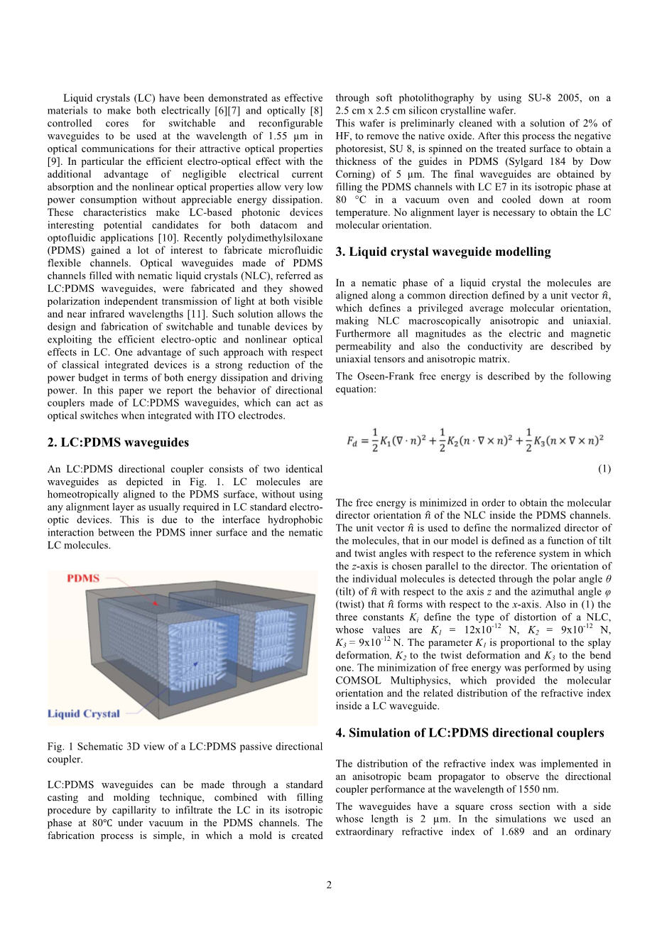 液晶(LC)已经被证明是有效的材料,以使得用于可切换和可重新配置波导的电学上的[6] [7]和光学上的[8]控制的芯在光学通信中用于1.55mu;m的波长[9]。 特别地,具有可忽略的电流吸收和非线性光学特性的附加优点的有效电光效应允许非常低的功率消耗,而没有明显的能量耗散。这些特性使得基于LC的光子器件成为数据通信和光流体应用的潜在候选[10]。最近聚二甲基硅氧烷(PDMS)获得了很多关注用来制造微流体柔性通道。制造由填充有向列型液晶(NLC)的PDMS通道(称为LC:PDMS波导)制成的光波导,并且它们在可见光和近红外波长下显示出偏振无关的光透射[11]。这种解决方案允许通过利用LC中的有效电光和非线性光学效应来设计和制造可切换和可调谐器件。关于经典集成器件的这种方法的一个优点是在能量耗散和驱动功率两方面功率预算的大大降低。在本文中,我们报告了由LC:PDMS波导制成的定向耦合器的行为,当与ITO电极集成时,其可以作为光开关。