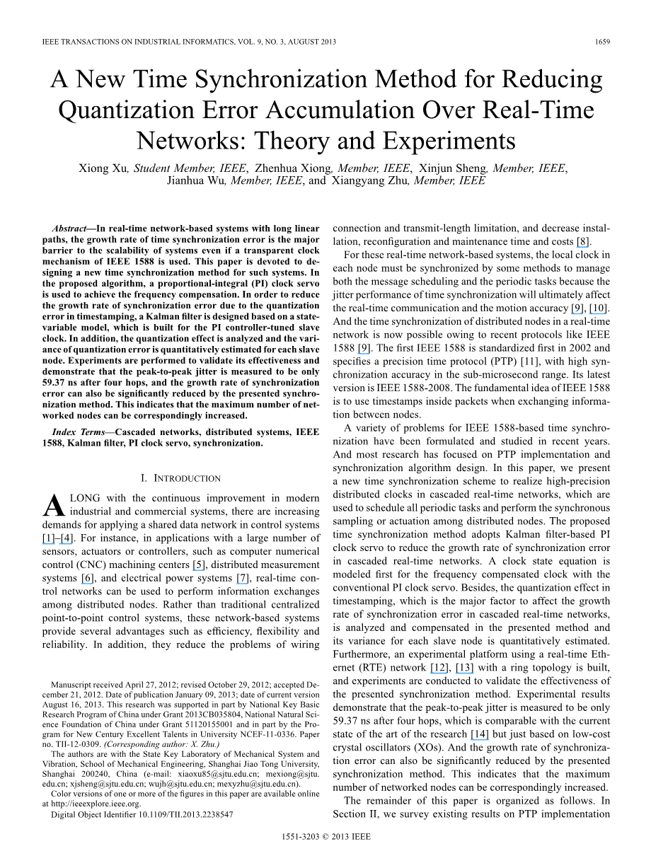 基于IEEE 1588 -时间同步中的各种问题在近年来已经制定和研究。并且大多数的研究都集中在PTP和同步算法设计的实现。在本文中,我们提出一个新的时间同步方案,实现高精度实时分布式时钟级联网络,用于安排所有周期性任务和执行分布式节点之间的同步采样或驱动。我们提议的时间同步方法采用基于过滤器PI时钟伺服的卡尔曼滤波来减少级联的实时网络的同步误差的增长速度。时钟状态方程建模首先补偿时钟频率与传统PI时钟伺服。除此之外,级联实时网络中影响同步误差的增长速度的主要因素,时间戳记的量子化效应,在每个从节点中以分析和补偿的方法并求其方差来定量估计。此外,一个实验平台使用一个构建了环型拓扑的实时以太网网络,通过实验进行验证了同步方法的有效性。相比较与当前流行的研究,仅仅基于低成本的晶体振荡器装置,抖动测量实验结果表明,峰后在四跳后只有59.37 ns。并且通过这种同步方法,同步误差的增长速度也可以显著减少了。这表明网络节点的最大数量可以相应地增加。