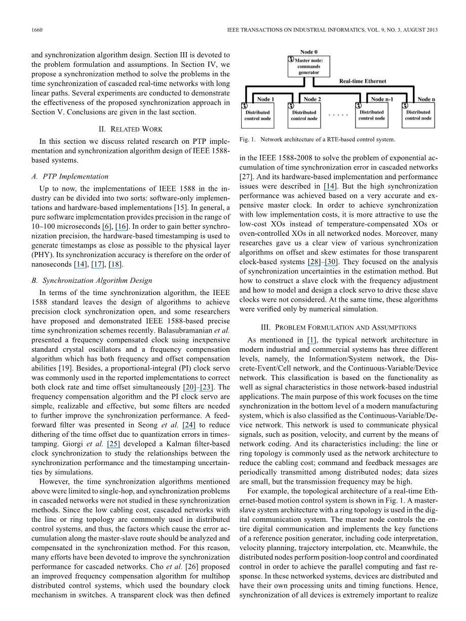 本文的其余部分组织如下:在第二部分中,我们调查现有结果PTP和同步算法设计的实现。第三部分是致力于制定和假设的问题。在第四节中,我们提出一个同步方法来解决这些在级联实时网络的时间同步长线性路径中的问题。