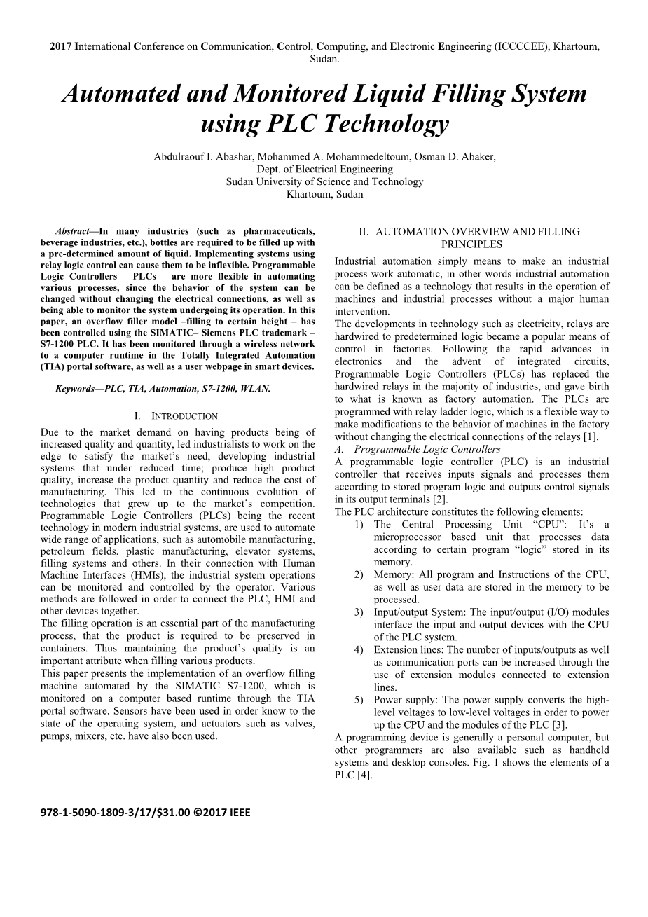 灌装操作是生产的重要组成部分。产品需要保存在容器。因此,保持产品的质量是填充各种产品时的重要属性。本文介绍了一种溢出填充的实现方法。由Simatic S7-1200自动控制的机器,即通过TIA在基于计算机的运行时监控门户软件。传感器已被用于了解操作系统和执行器(如阀门)的状态,还使用了泵、搅拌机等。