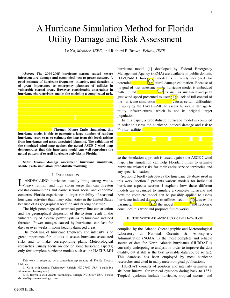 摘要 - 2004-2005年飓风季节对电力系统造成严重的基础设施损坏和经济损失。 对飓风频率,强度和持续时间的良好估计对脆弱沿海地区公用事业的紧急计划者非常重要。 然而,飓风特征的相当大的不确定性使得建模是一项复杂的任务。本文提出了一个概率模型,可以模拟佛罗里达州的飓风年。 该模型确定一年中在佛罗里达登陆的飓风数量; 并且每个模拟的飓风被概率地分配登陆信息,诸如位置,进场角,平移速度,最大风速和到最大风的半径。 随着飓风移过佛罗里达,进一步模拟其内陆特征,包括风速衰减率,中心压力填充率,风场剖面和持续时间。通过蒙特卡罗模拟,这种飓风模型能够产生大量随机飓风年份,以便估计飓风造成的长期风险水平,并协助相关规划。 针对实际ASCE 7风图的模拟风图的验证表明,该飓风模型可以很好地再现佛罗里达州整体飓风活动的实际模式。