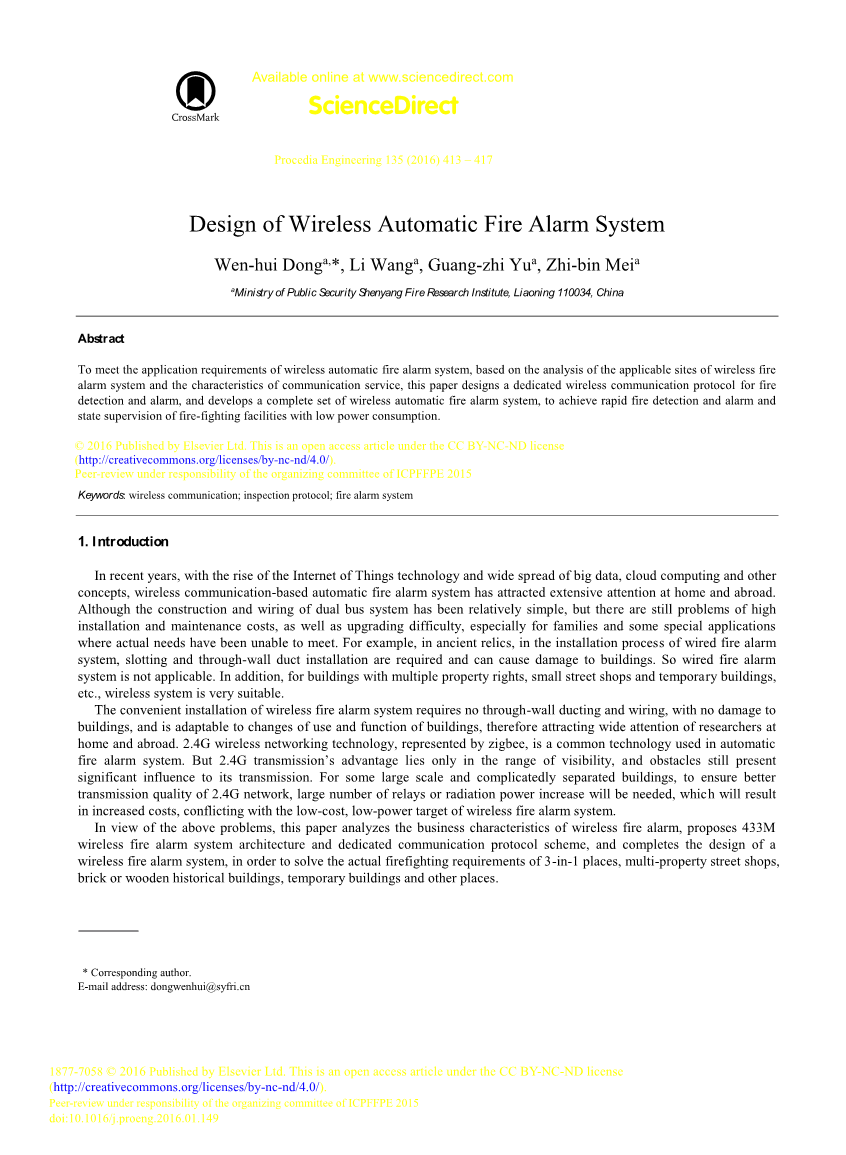 摘要:在分析无线火灾自动报警系统的适用场地和通信业务特点的基础上,针对无线火灾自动报警系统的应用需求,本文设计了专用的火灾探测和无线报警通信协议,设置无线自动火灾报警系统,实现快速火灾探测和低功耗消防设施的报警和状态监控。