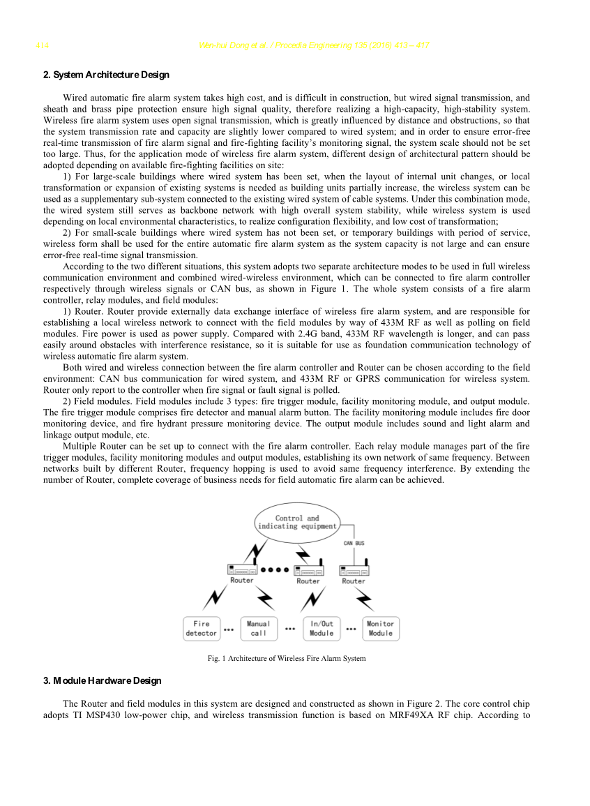 近年来,随着物联网技术的兴起以及大数据,云计算等概念的广泛传播,基于无线通信的火灾自动报警系统已引起国内外的广泛关注。虽然双母线系统的建设和布线比较简单,但仍存在安装维护成本高,升级难度大的问题,特别是对于家庭和实际需求无法满足的特殊应用场合。例如,在古代建筑物中,在有线火灾报警系统的安装过程中,需要开槽和贯穿墙壁的管道安装,并可能造成建筑物的损坏。所以有线火灾报警系统不适用。另外,对于拥有多个产权的建筑物,小街铺和临时建筑物等,无线系统非常适合。