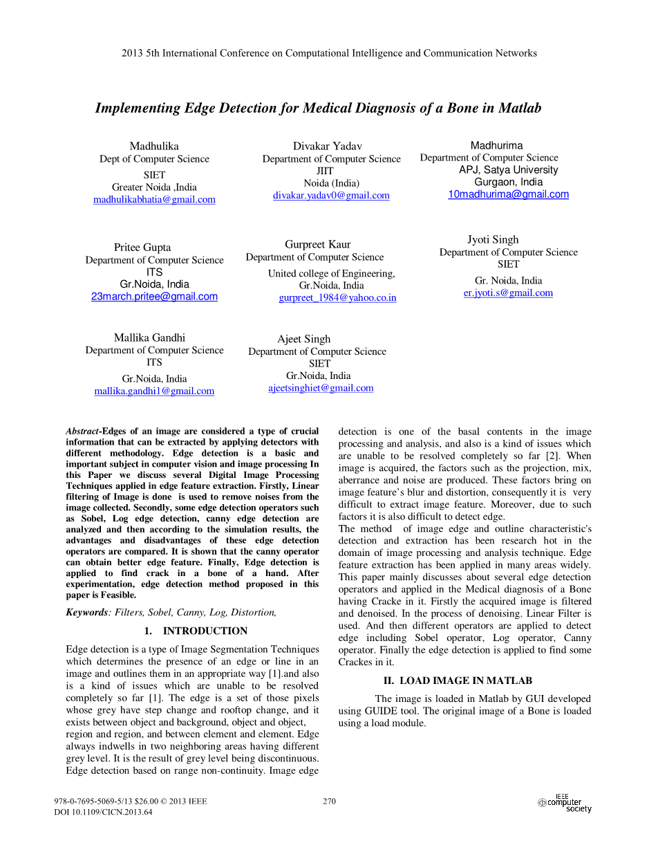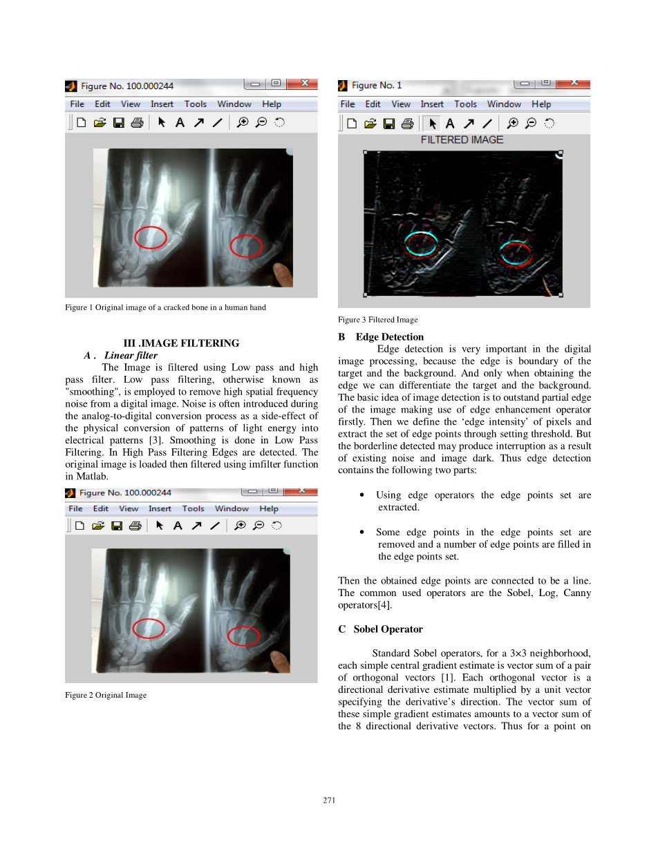图像边缘和轮廓特征的检测和提取方法已经在图像处理和分析技术领域进行了研究。边缘特征提取广泛应用于许多领域。本文主要讨论了几个边缘检测算子,并应用于具有裂缝的骨骼的医学诊断中。首先,对所获取的图像进行滤波和去噪。在去噪过程中,使用线性滤波器。然后应用不同的运算符来检测边缘,包括Sobel运算符,Log运算符,Canny运算符。最后应用边缘检测来找到一些裂纹。