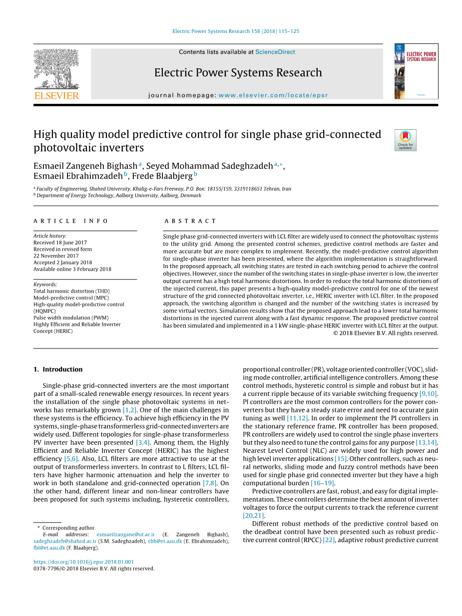 Single phase grid-connected inverters with LCL fifilter are widely used to connectthe photovoltaic systems to the utility grid. Among the presented control schemes, predictive control methods are faster and more accurate but are more complex to implement. Recently, the model-predictive control algorithm for single-phase inverter has been presented, where the algorithm implementation is straightforward. In the proposed approach, all switching states are tested in each switching period to achieve the control objectives. However, since the number of the switching states in single-phase inverter is low,the inverter output current has a high total harmonic distortions. In order to reduce the total harmonic distortions of the injected current, this paper presents a high-quality model-predictive control for one of the newest structure of the grid connected photovoltaic inverter, i.e., HERIC inverter with LCL fifilter. In the proposed approach, the switching algorithm is changed and the number of the switching states is increased by some virtual vectors. Simulation results show that the proposed approach lead to a lower total harmonic distortions in the injected current along with a fast dynamic response. The proposed predictive control has been simulated and implemented in a 1 kW single-phase HERIC inverter with LCL fifilter at the output.