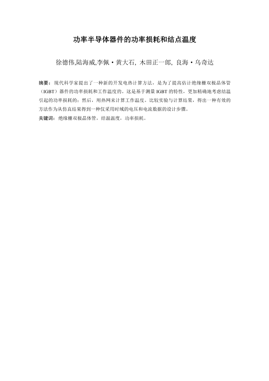 功率半导体器件的功率损耗和结点温度外文翻译资料 2023-03-05 17:22:44 英语原文共 6 页,剩余内容已隐藏,支付完成后下载完整资料 英语译文共 11 页,剩余内容已隐藏,支付完成后下载完整资料 资料编号:[21783],资料为PDF文档或Word文档,PDF文档可免费转换为Word 原文和译文剩余内容已隐藏,您需要先支付 30元 才能查看原文和译文全部内容!立即支付 发小红书推广免费获取该资料资格。点击链接进入获取推广文案即可: Ai一键组稿 | 降AI率 | 降重复率 | 论文一键排版 PREVIOUS NEXT 您可能感兴趣的文章 精益和自动化生产及物流外文翻译资料 精益自动化生产和物流外文翻译资料 精益化和自动化的制造和物流外文翻译资料 精益自动化的制造和物流外文翻译资料 生产与物流的精益化和自动化外文翻译资料 无刷直流电机闭环速度控制原型设计与实现方法外文翻译资料 无线HART网络控制外文翻译资料 基于单片机的智能鱼缸的设计外文翻译资料 基于单片机的盆花自动浇水控制系统设计外文翻译资料 基于PLC的空气循环净化系统外文翻译资料
