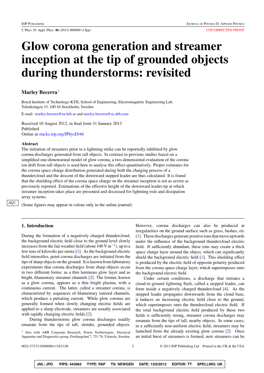 (a)垂直于高物体帽面的电场是恒定的,由帽尖处的电场定义(图1中的A)。因此,一个高的物体在整个帽面上发射同样强度的电晕离子。