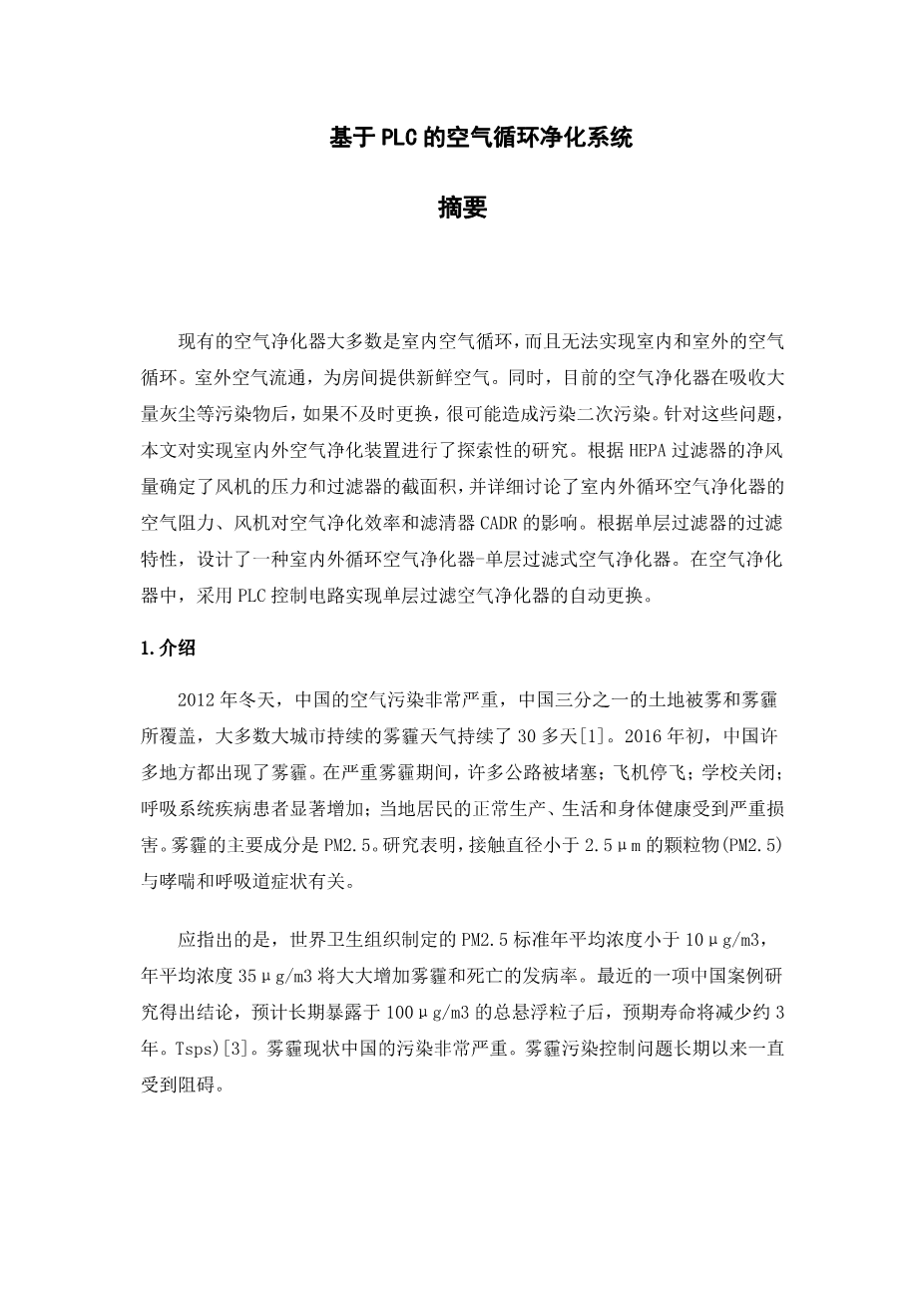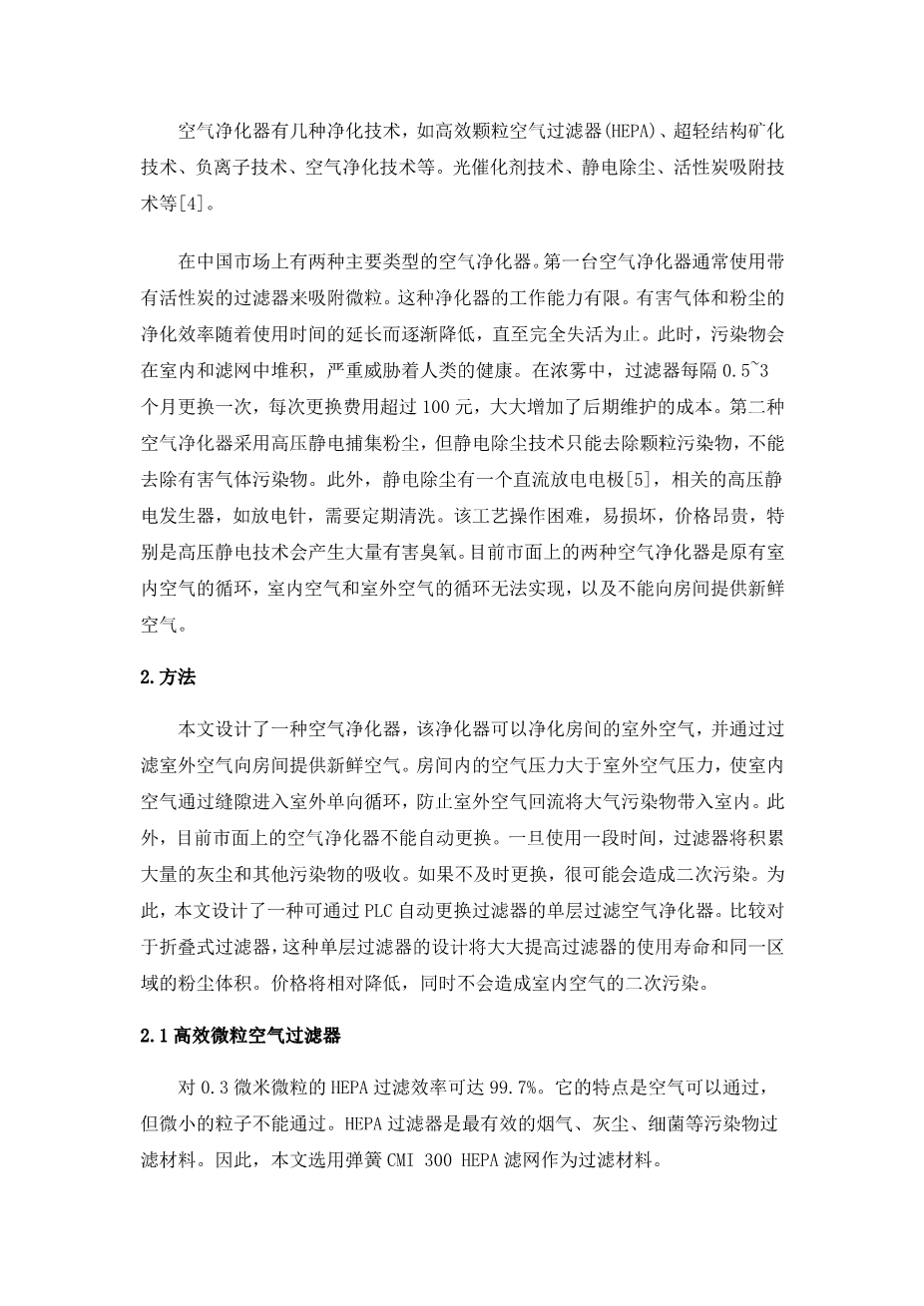 This paper designs an air purifier that can purify the outdoor air to the room and fresh air is supplied to the room by filtering outdoor air. The air pressure in the room is greater than the outdoor air pressure so that the air in the room passes through the gaps to the outdoor one-way circulation and prevents outdoor air backflow from bringing atmospheric pollutants into the room. In addition, the current air purifier filter on the market cannot be automatically replaced. Once used for some time, the filter will accumulate large amounts of dust and other pollutants in the absorption. If not timely replacement, it will be likely to cause secondary pollution. Therefore, this paper designed a single-layer filter air purifier that can automatically replace the filter through the PLC. Compared to the folded filter, this single-layer filter design will greatly improve the filterrsquo;s life and the volume of dust of the same area. The price will be relatively decreased, while not causing secondary pollution of indoor air.