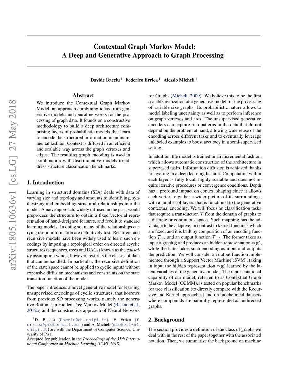 我们介绍了语境图马尔可夫模型,这是一种将生成模型和神经网络的思想结合起来处理图形数据的方法。它以一种建设性的方法为基础,构建一个由概率模型层组成的深层架构,该架构学习以增量的方式编码结构化信息。上下文以一种高效且可伸缩的方式在图形顶点和边缘之间进行扩散。所得到的图编码与判别模型结合使用来处理结构分类基准。