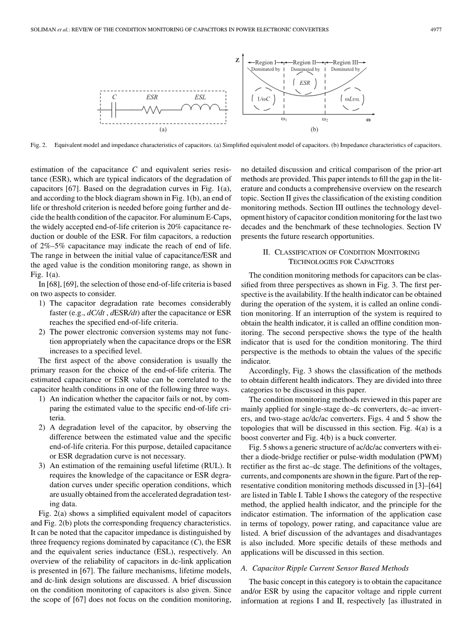 [67]中介绍了直流链路应用中电容器可靠性的概述。讨论了故障机制,寿命模型和直流链路设计解决方案。还简要讨论了电容器的状态监测。由于[67]的范围不关注状态监测,因此没有提供现有技术方法的详细讨论和关键比较。本文旨在填补文献中的空白,并对研究课题进行全面的概述。第二节给出了现有状态监测方法的分类。第三部分概述了二十年来电容器监测的技术发展历史以及这些技术的基准。第四节介绍了未来的研究机会。